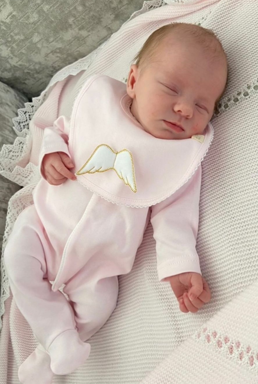 • bebé dormindo com fato de treino rosa e babete com asas bordadas a dourado
