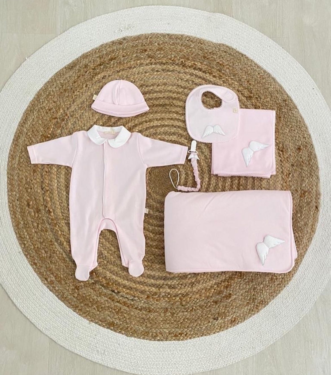 • Conjunto de roupa e acessórios de bebé cor de rosa sobre tapete redondo em tons naturais.