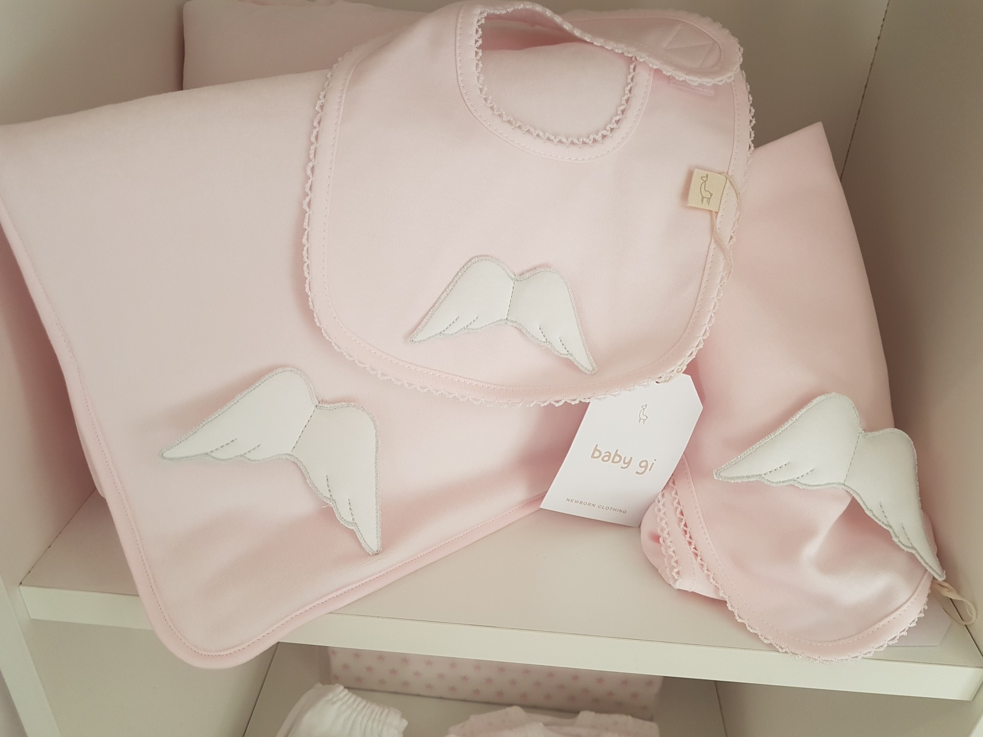 • Conjunto bebé cor-de-rosa com asas brancas e rendados numa prateleira