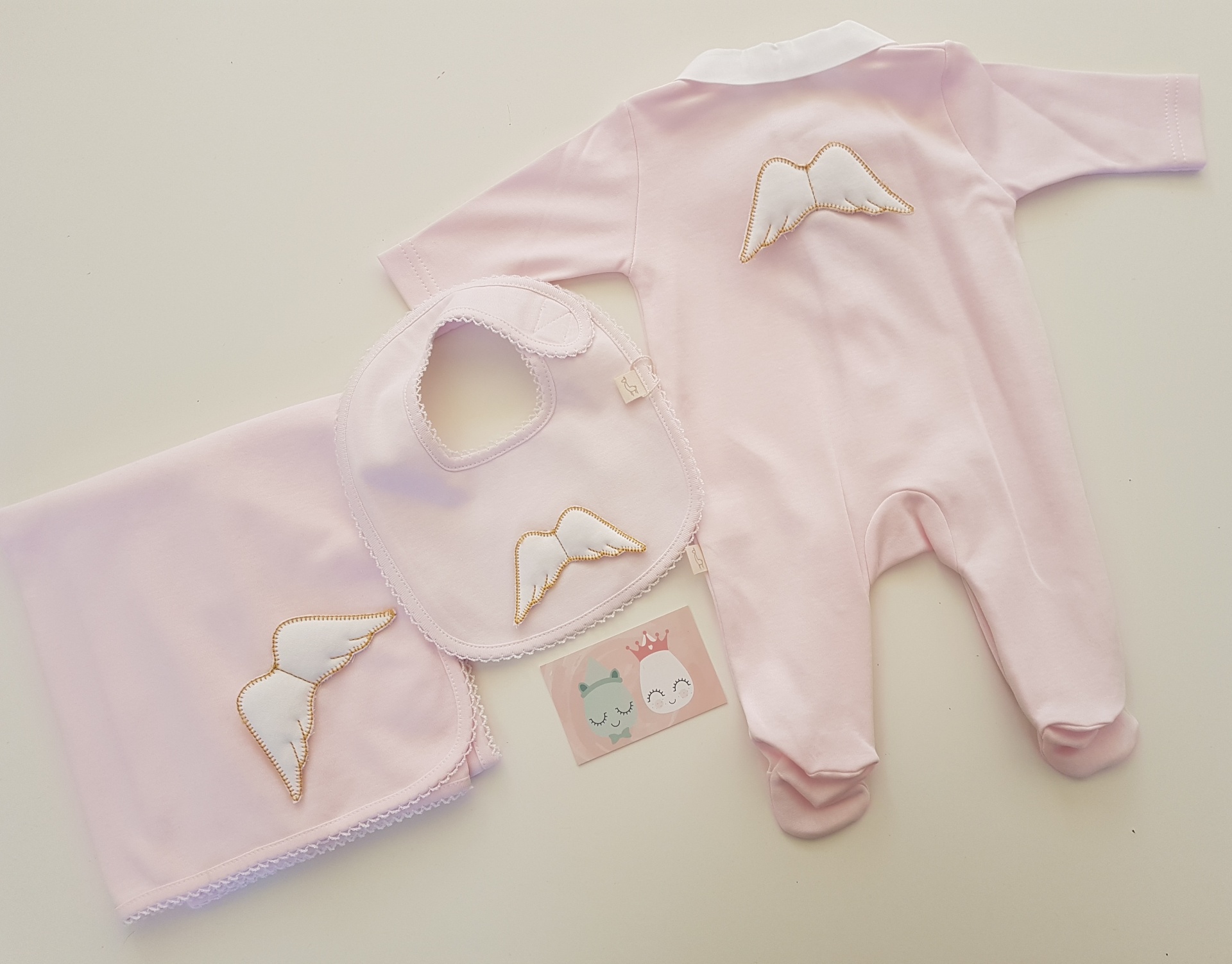 • Conjunto de roupa de bebé rosa com padrão de asas brancas
