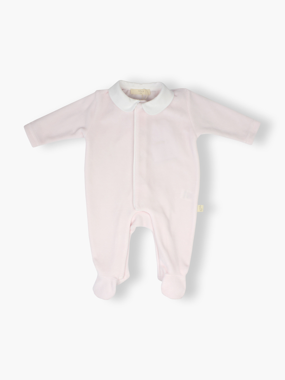 • Macacão de bebé rosa claro com gola branca e pés incluídos