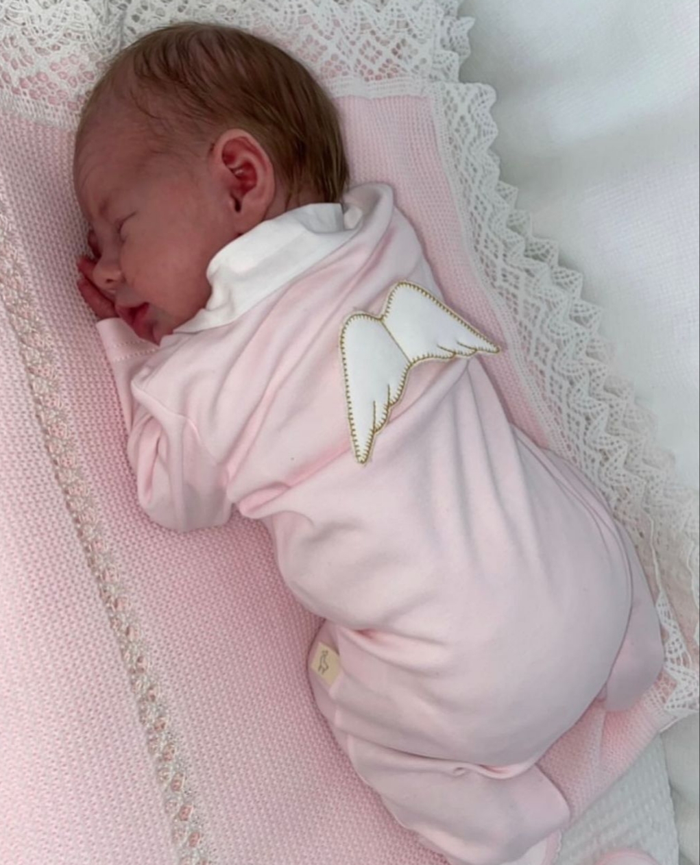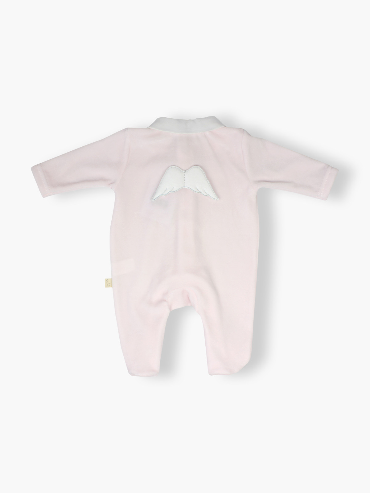 • Bebé a dormir com macacão rosa com asas e manta rosa bordada