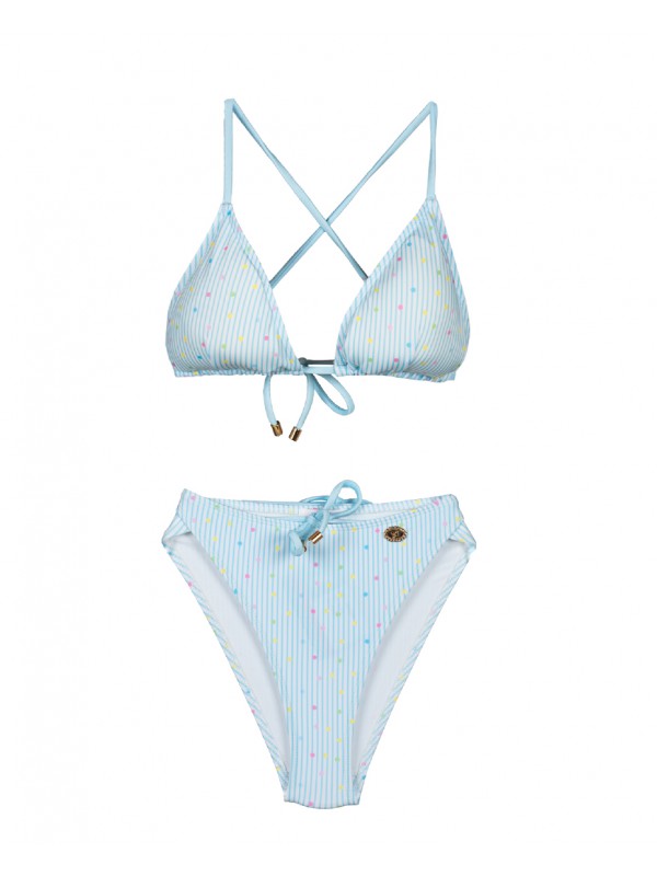 • Biquíni azul claro com riscas e pontos coloridos, top com alças cruzadas e braguilha com cordão.