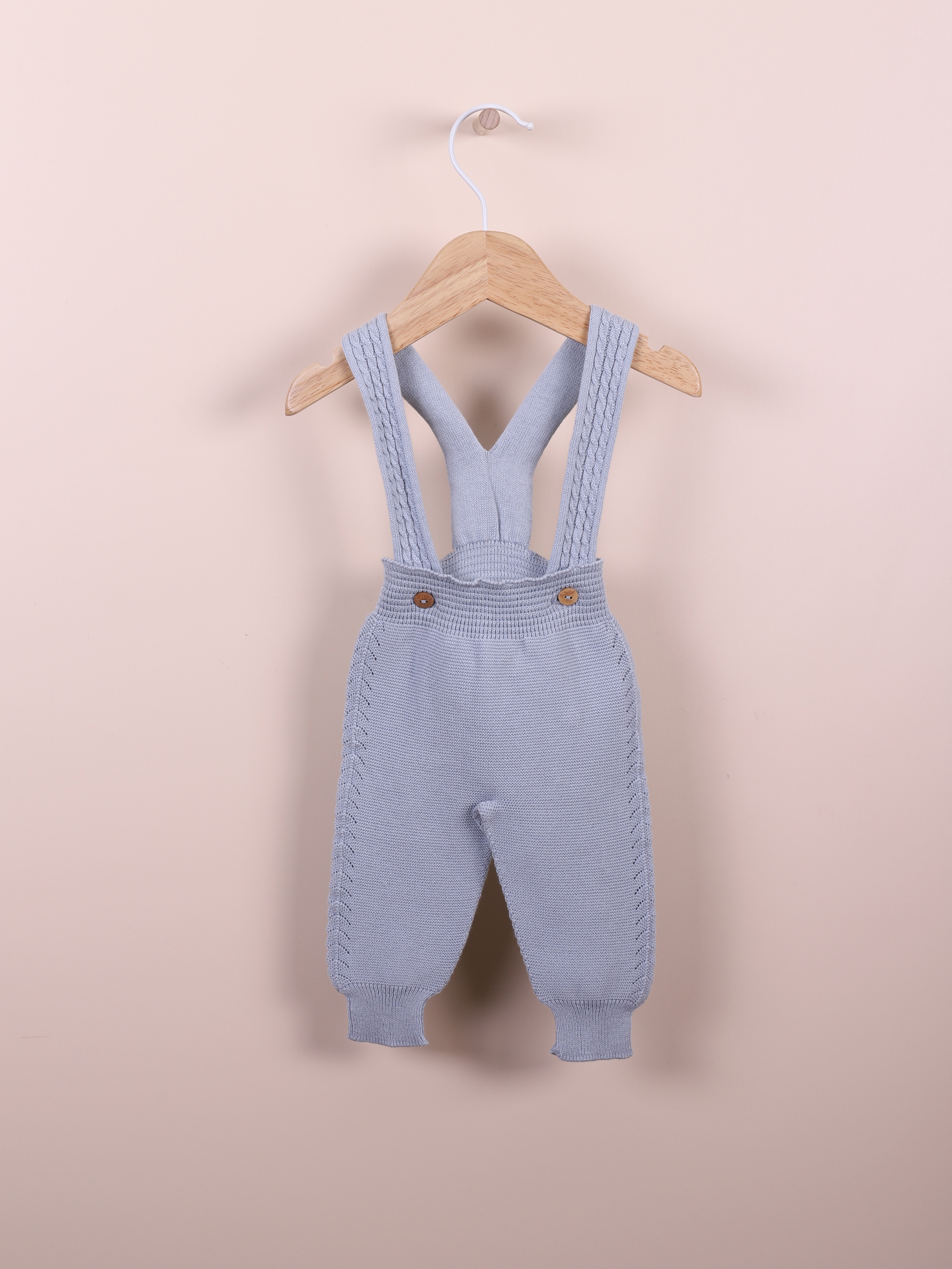 • Calças de bebé em malha azul clara com alças e botões em madeira