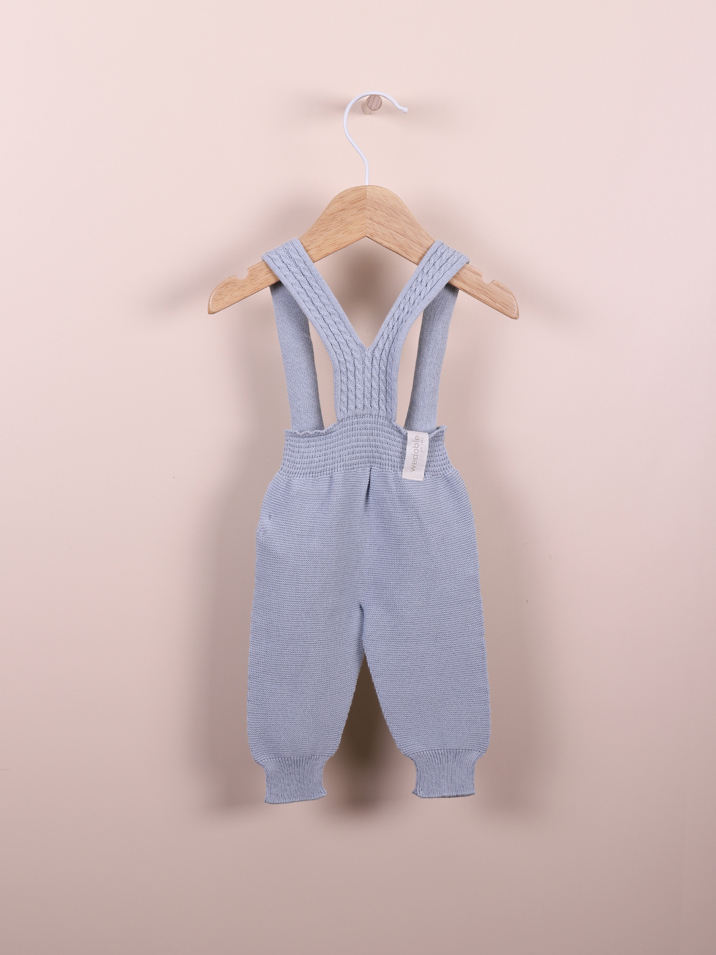 • Calças de malha azul claro para bebé com alças, penduradas num cabide de madeira