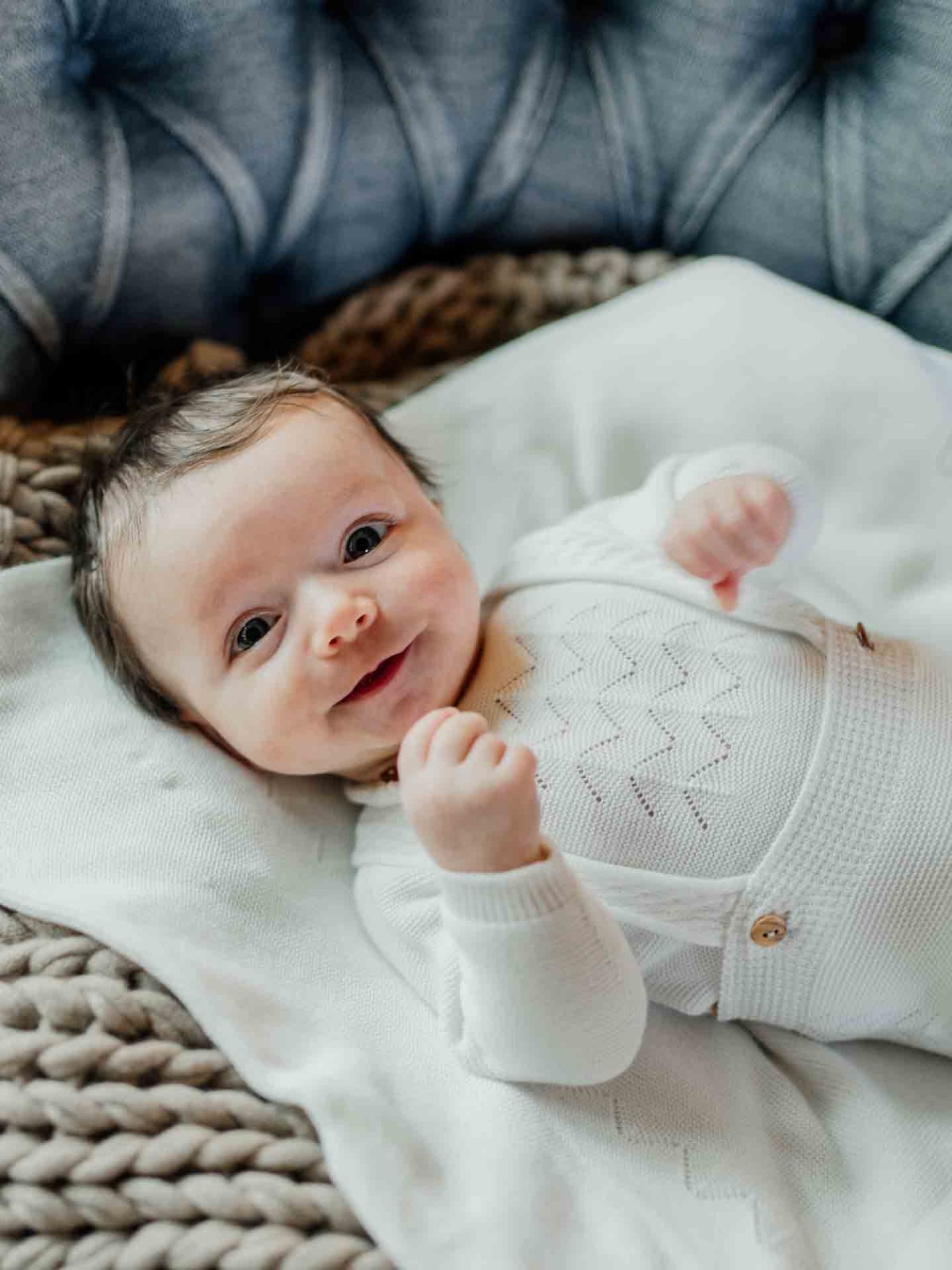 As alças apertam na frente com botões madeira. A cinta elástica suave permite obter o melhor conforto. Produzido em Wholegarment, uma peça completa sem costuras, para maior conforto do seu bebé.
