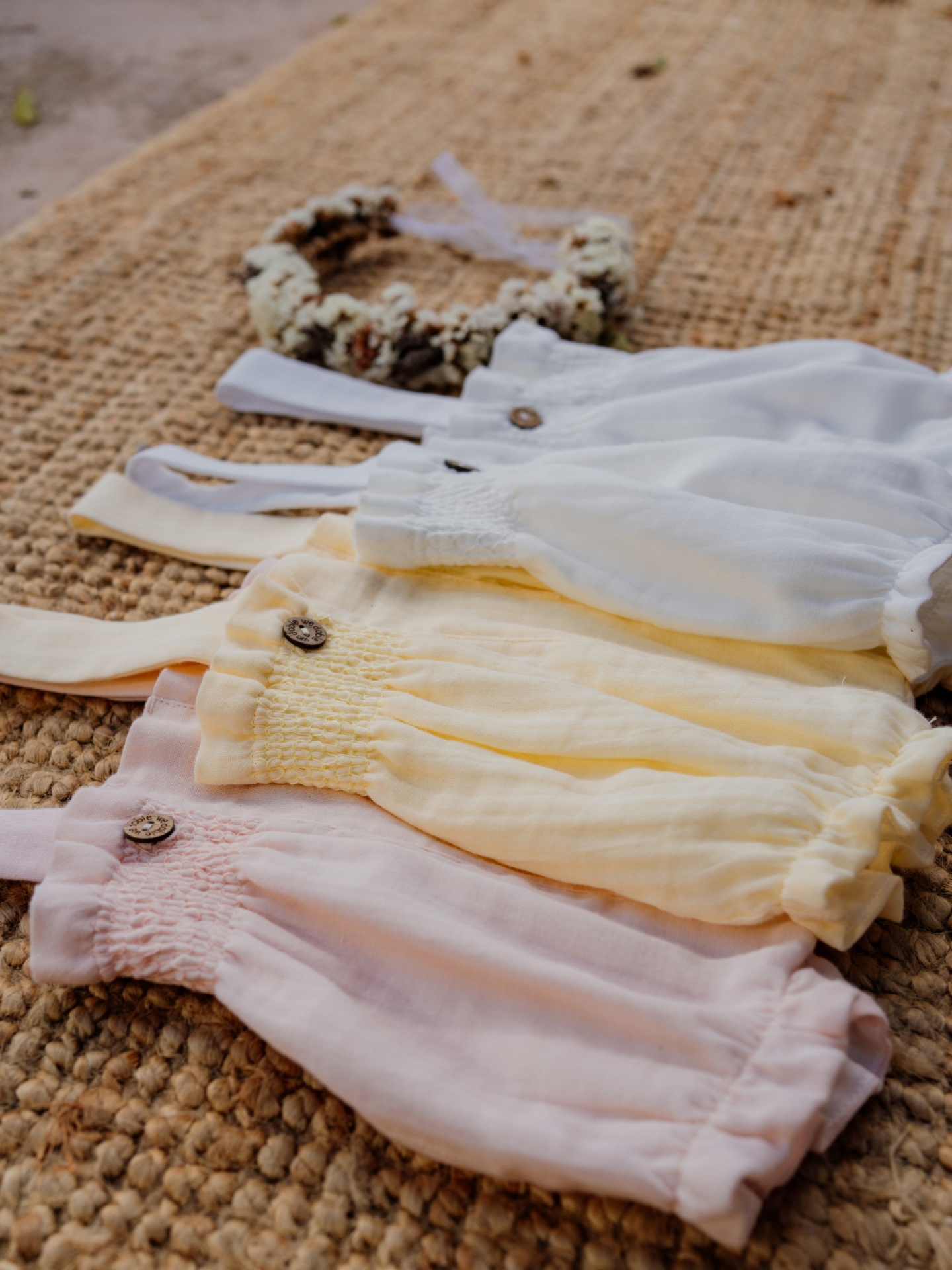 • Três jardineiras para bebé em rosa, amarelo e branco sobre tecido texturado com coroazinha de flores secas