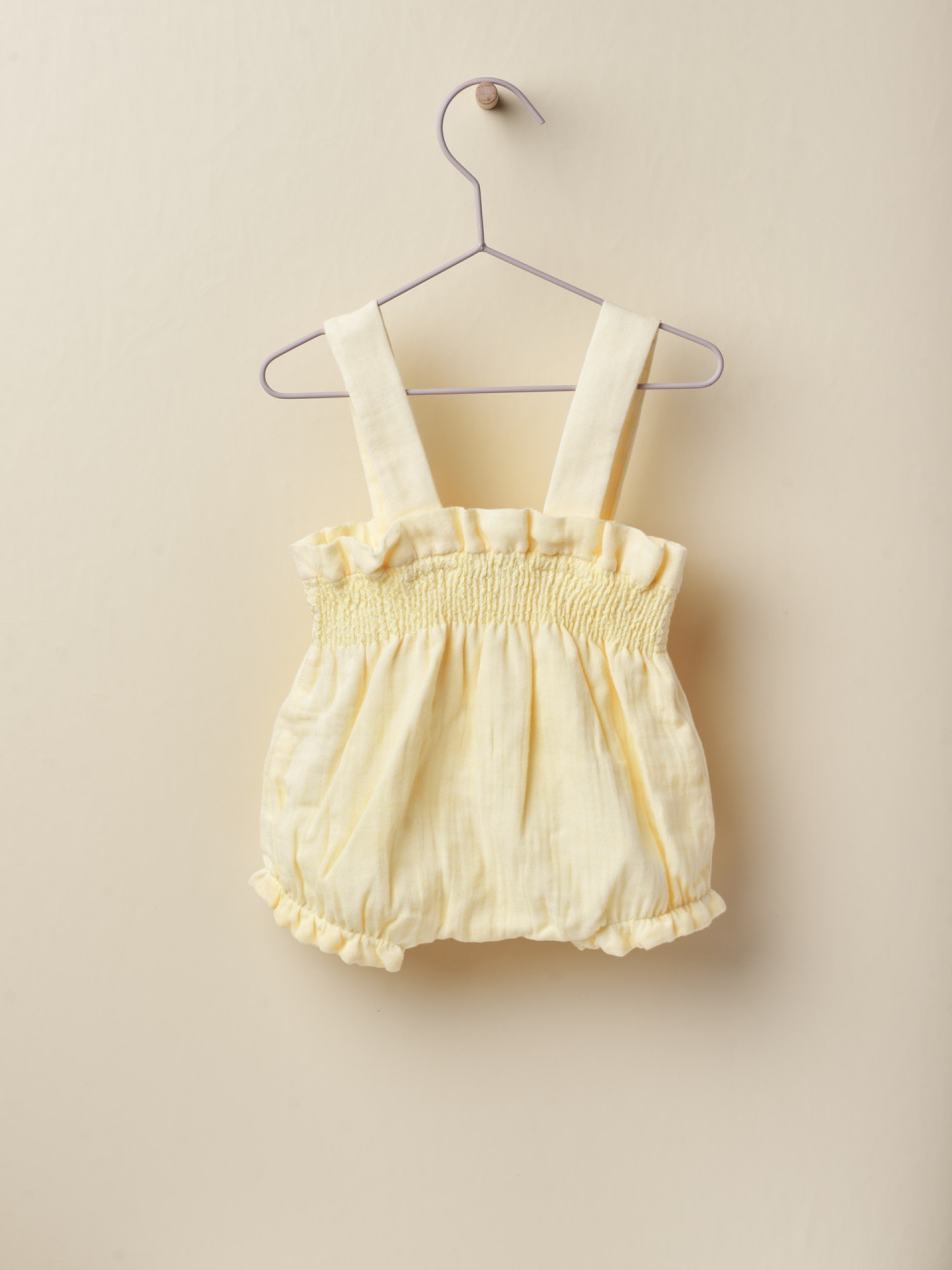 • Macacão de bebé amarelo claro com alças largas e folhos pendurado num cabide