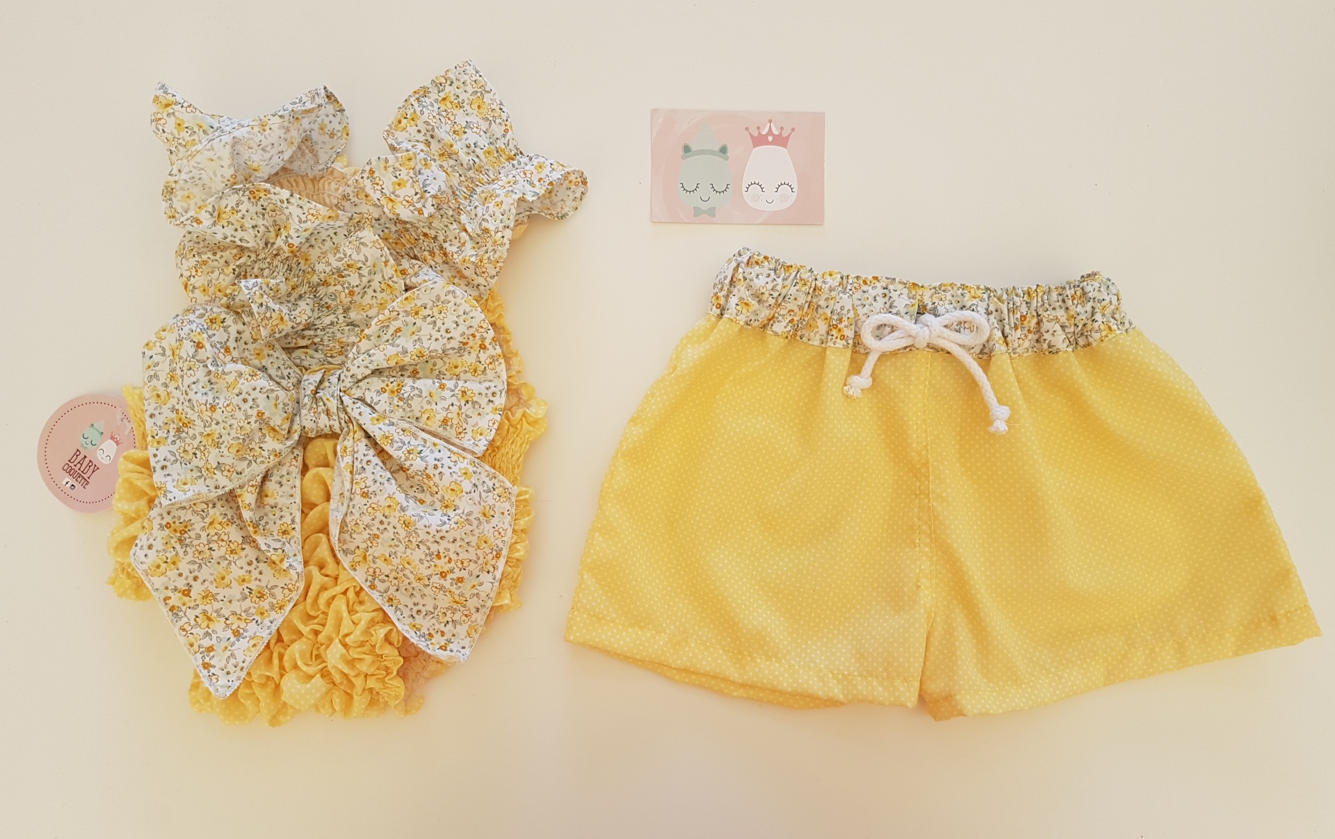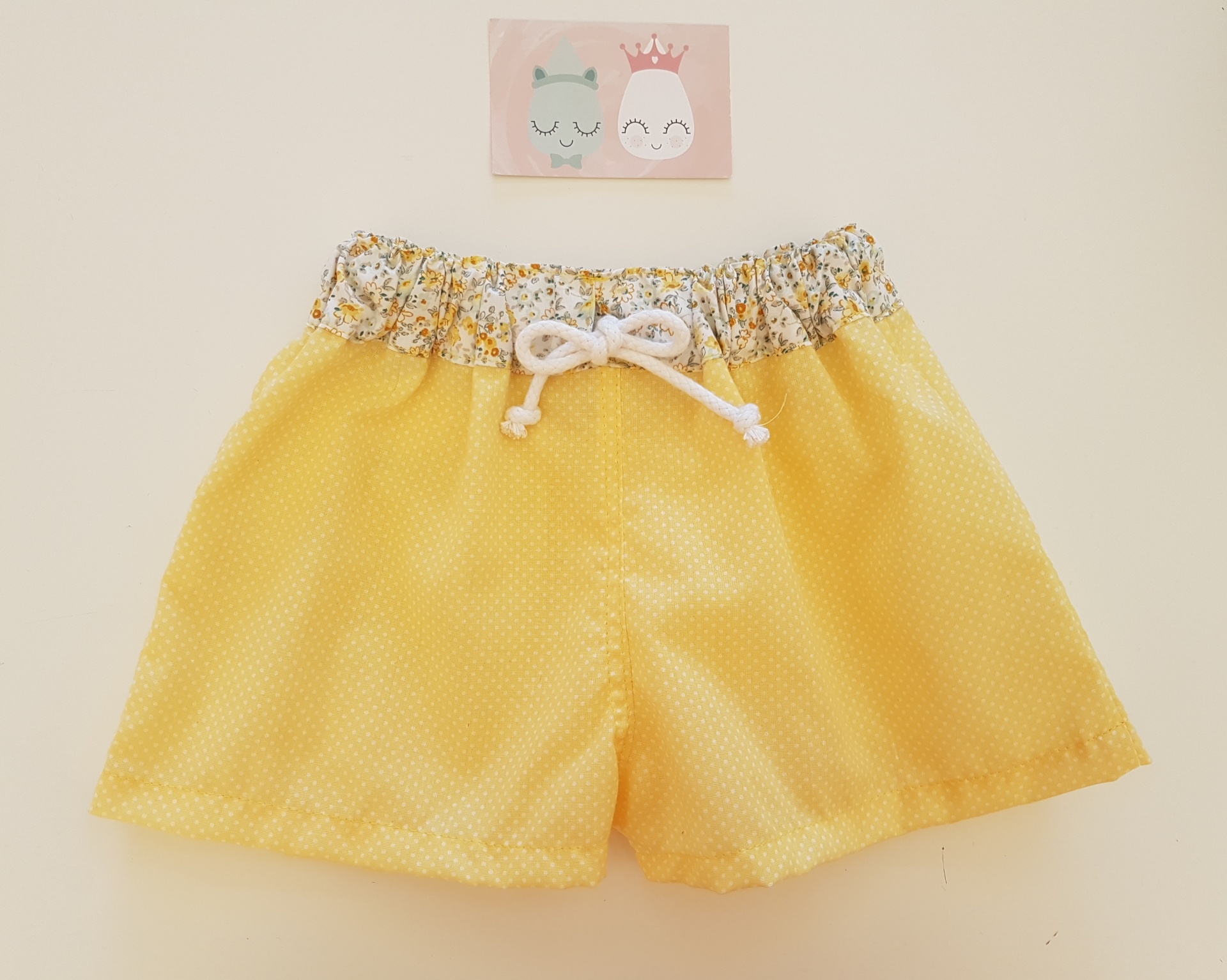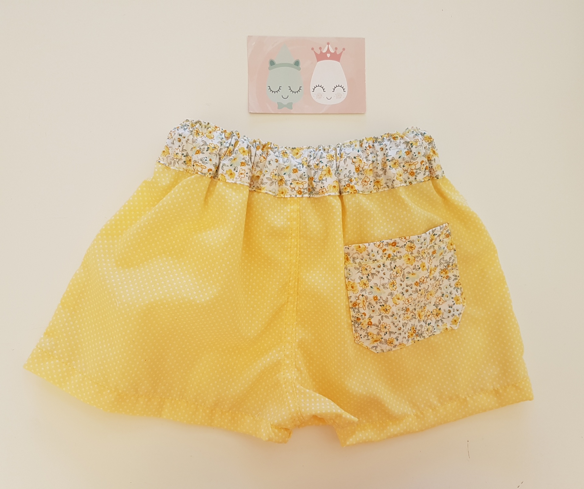 • Calções de criança amarelos com bolso floral e cós elástico, sobre fundo claro com cartão decorativo rosa