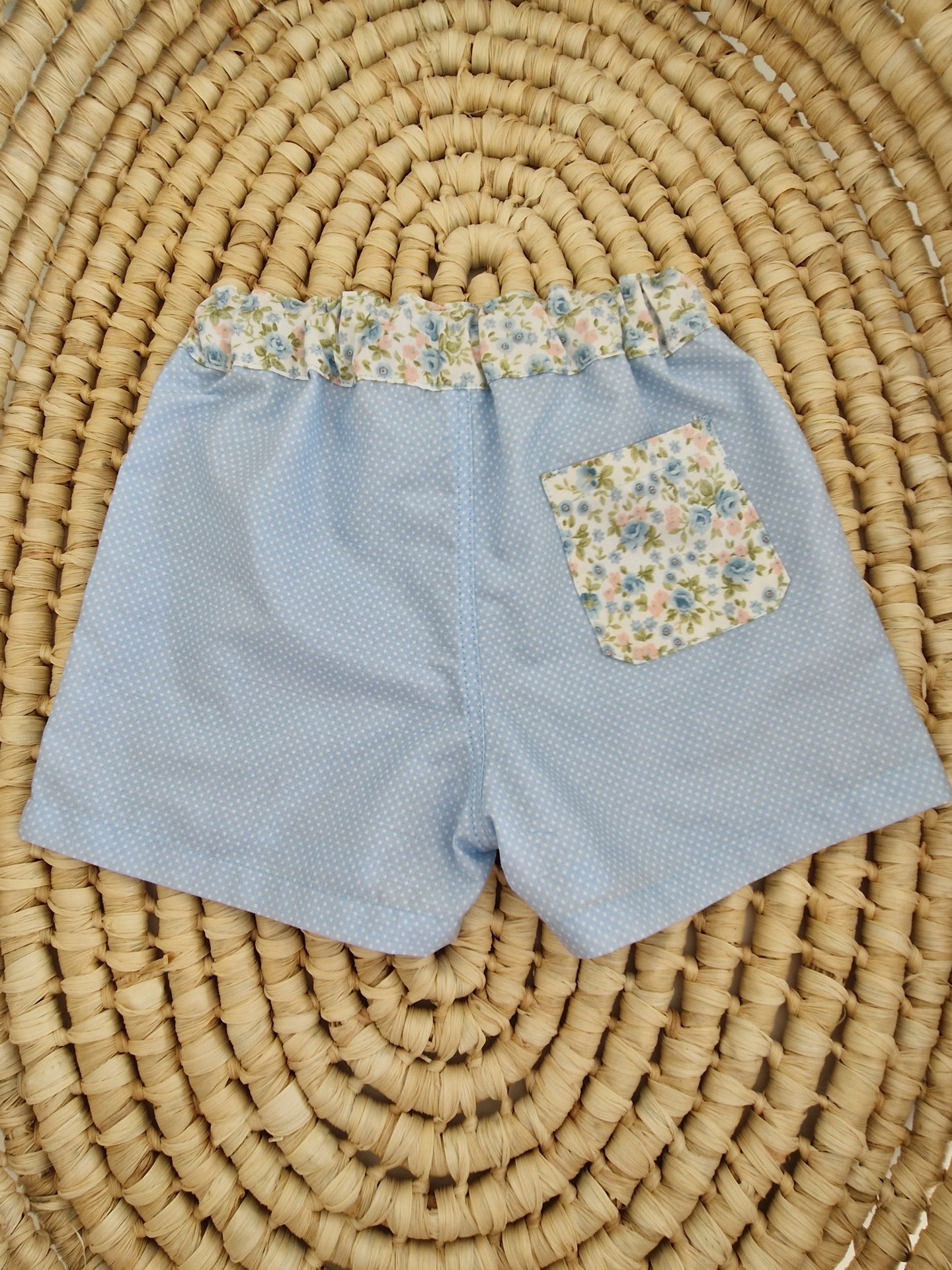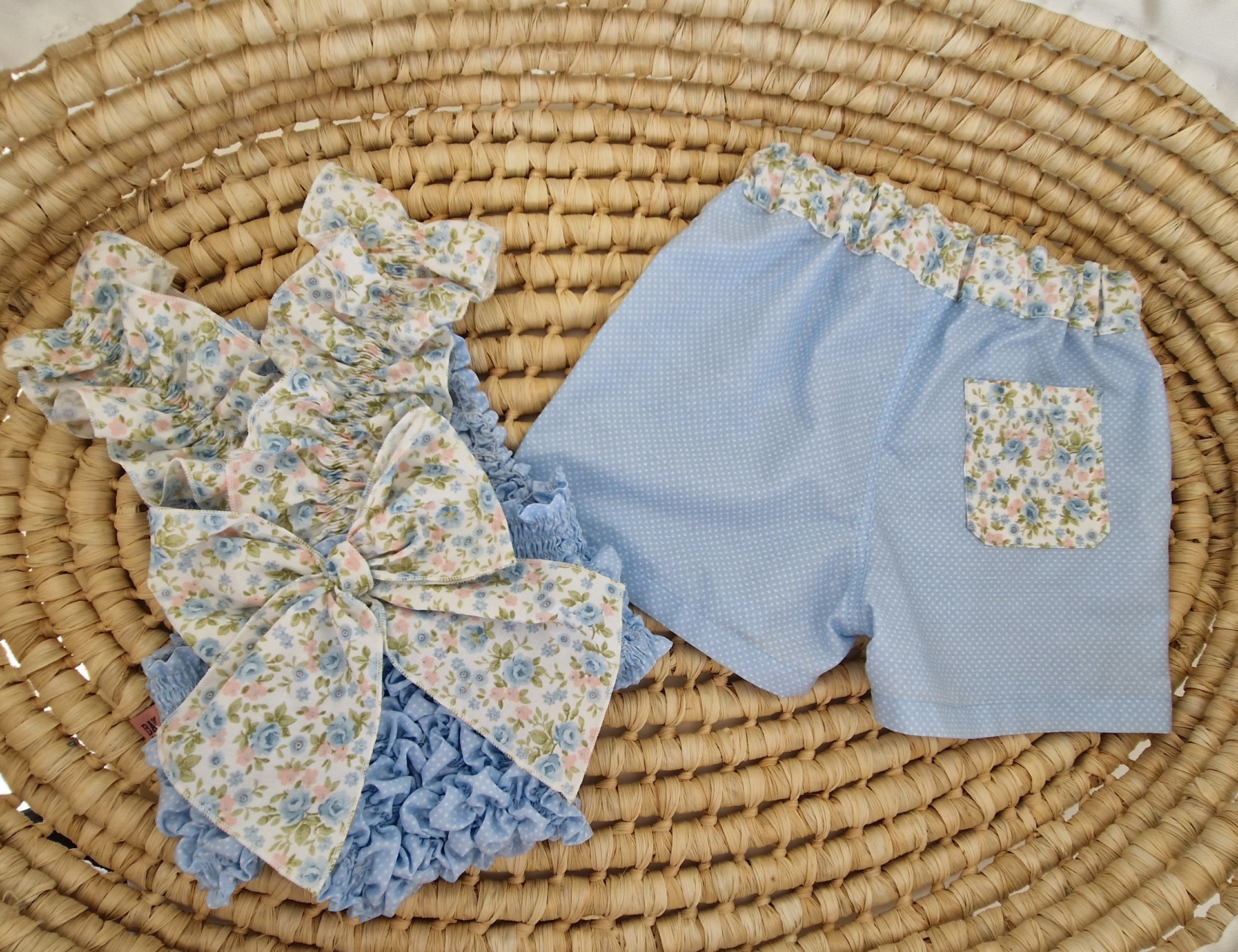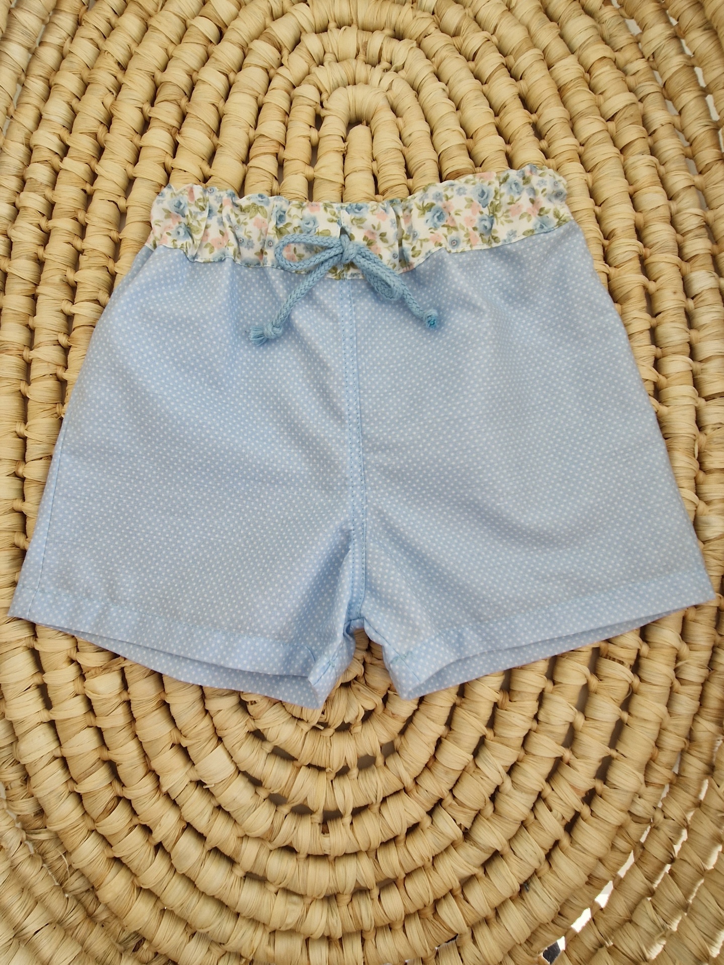 • Calções de criança azuis com folho floral e cordão, sobre tapete de fibra natural trançada