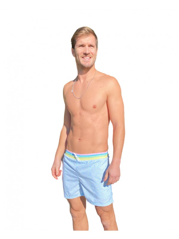 • Homem a usar calções de banho azul claro com riscas brancas e cós colorido