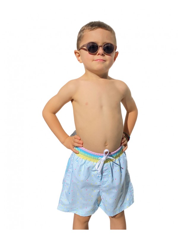 • Calções de banho para criança azuis com riscas finas e cintura colorida