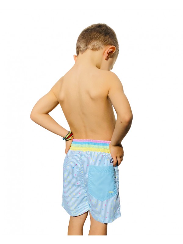 • Criança de costas com calções de banho azul claro com riscas e padrão de pontos coloridos