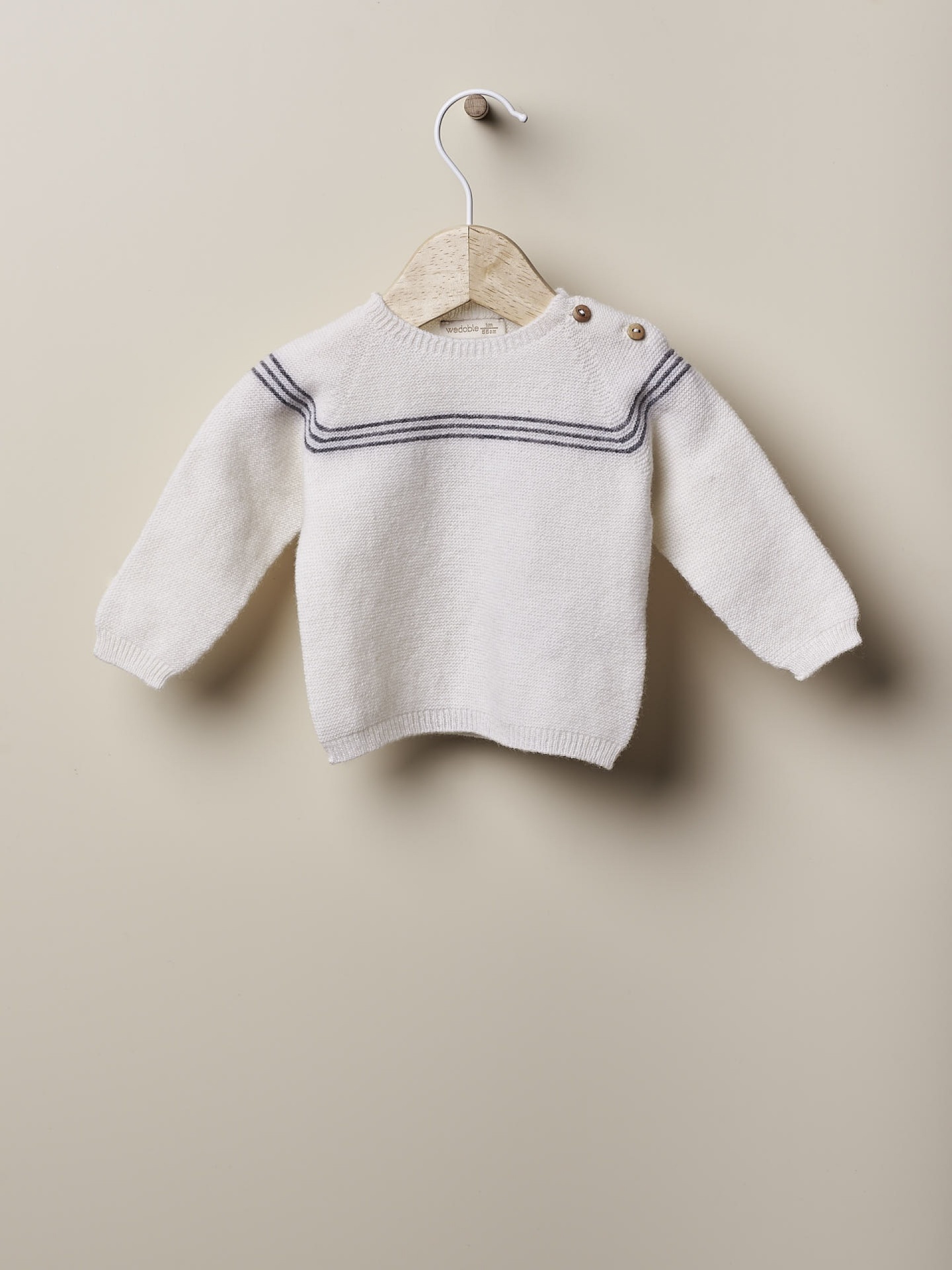 Camisola tricotada em malha de lã merino extra fina, suave e respirável. A camisola de manga comprida LOVE IN WINTER DAYS aperta no ombro com botões de madeira. Produzida com a tecnologia Wholegarment, esta peça é completa e sem costuras, para maior conforto do seu bebé.