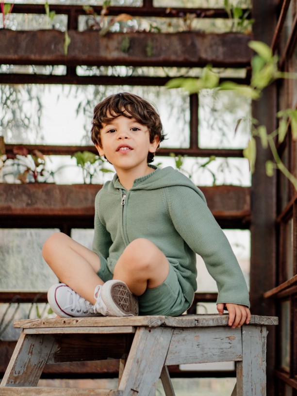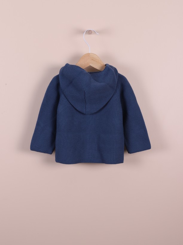 Casaco de manga comprida tricotado em algodão suave, ideal para bebés meninos e meninas, até aos 4 anos. O casaco MADAGASCAR com capuz, aperta na frente com fecho.