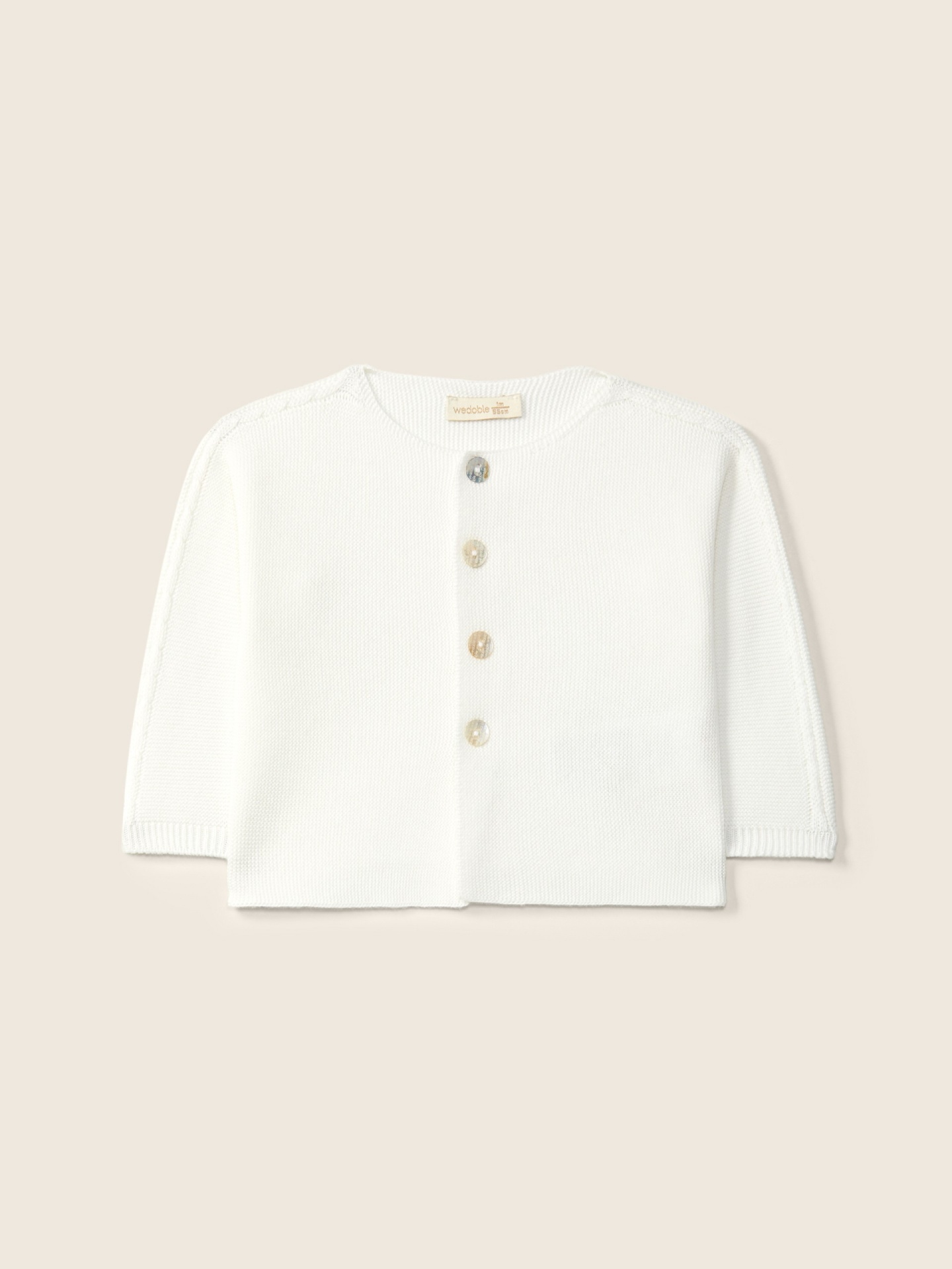 Casaco de manga comprida tricotado em malha de algodão orgânico suave, ideal para bebés meninos e meninas, até aos 4 anos. O casaco com decote redondo MY TINY FRIENDS aperta na frente com botões madrepérola. Produzido em Wholegarment, uma peça completa sem costuras, para maior conforto do seu bebé.
