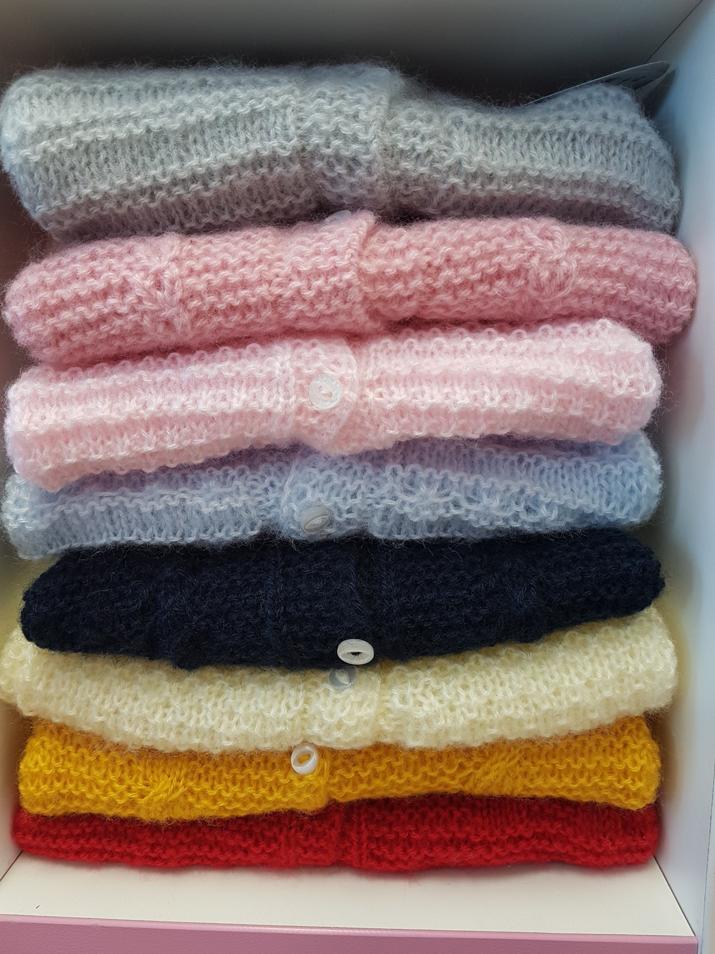• Blusas de malha coloridas empilhadas, cada uma com botão branco, dentro de uma caixa branca
