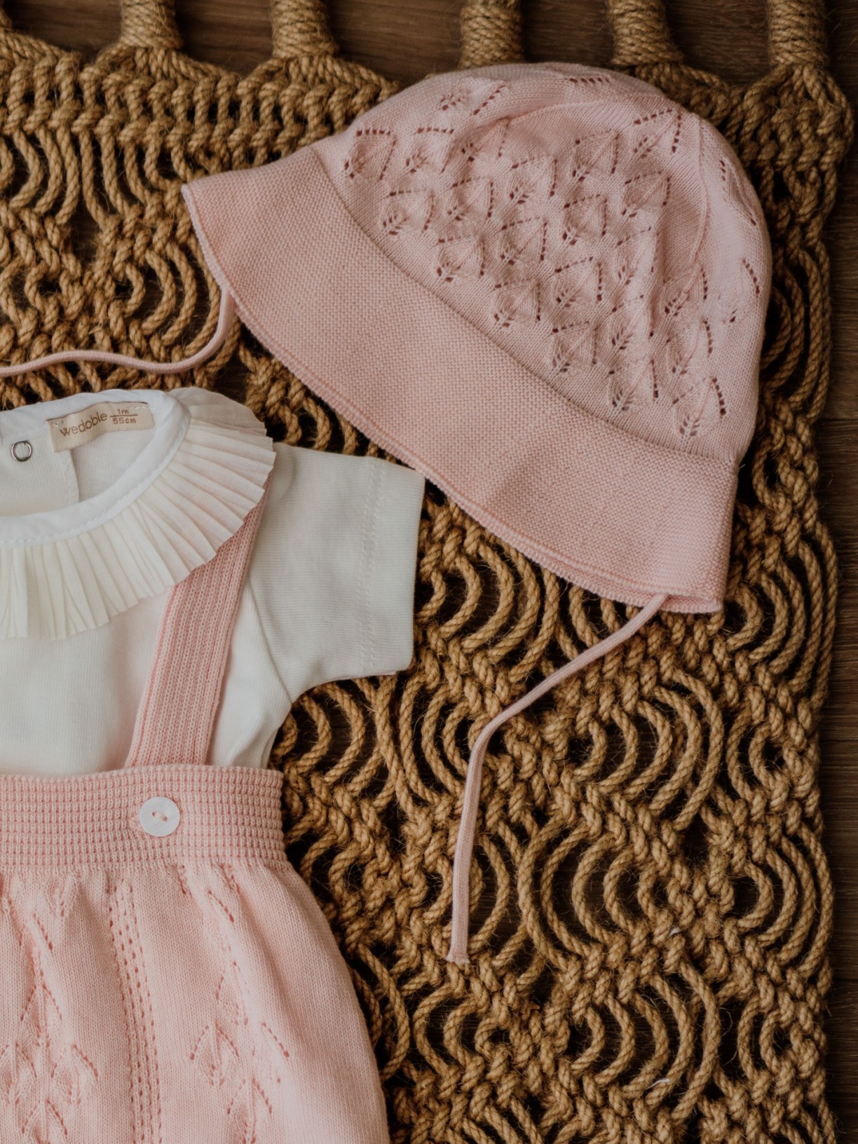 Conjunto de roupa de bebé rosa e branco sobre tapete de corda