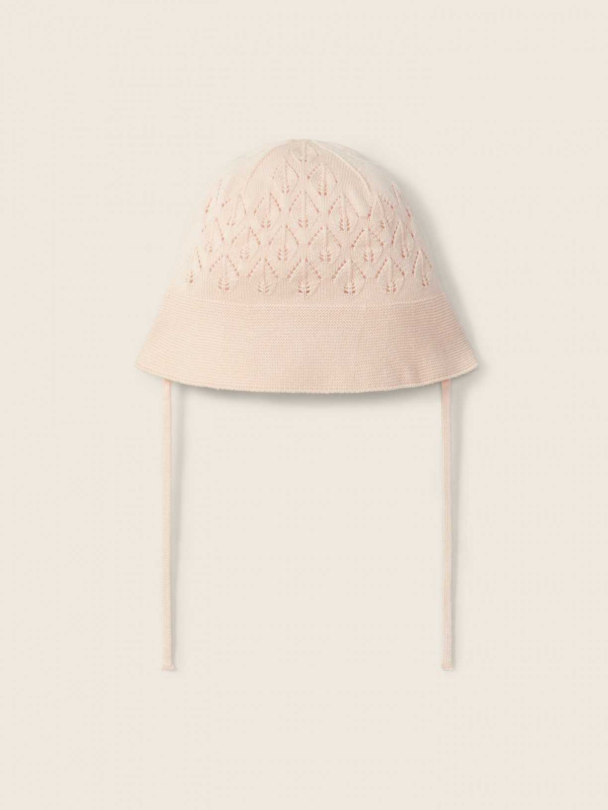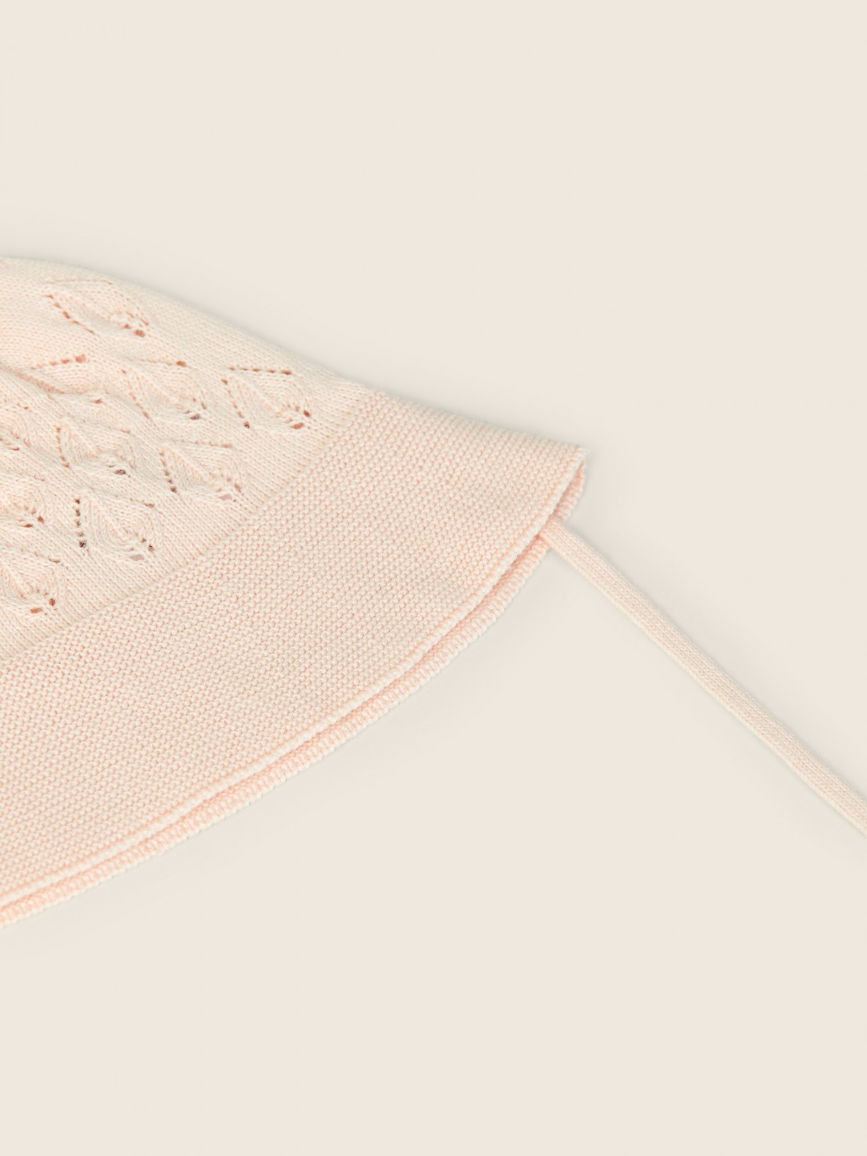 • Touca de malha rosa clara com padrão vazado e fita para amarrar