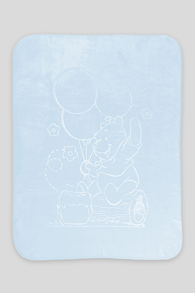 • Manta azul clara para bebé com urso a segurar balões em relevo