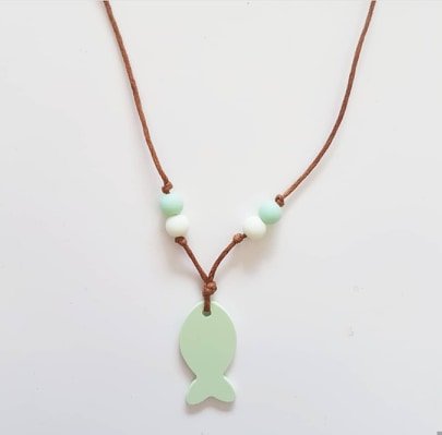 • Colar com pendente em forma de peixe verde claro e contas brancas e verdes em cordão castanho