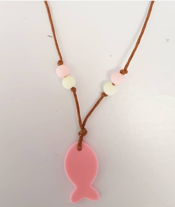 • Colar com pendente em forma de peixe rosa, contas e cordão castanho