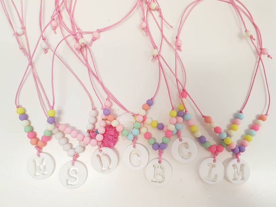 Colares em cordão rosa com iniciais em medalha branca e contas coloridas.