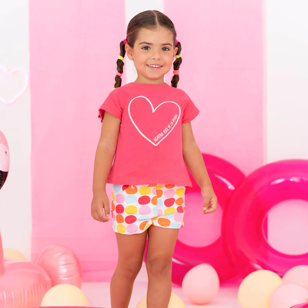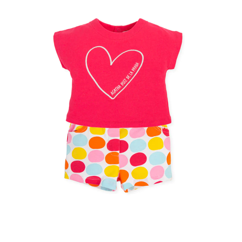 Conjunto de algodão, calções com padrão de bolas coloridas e t-shirt rosa com coração, Agatha Ruiz de la Prada.