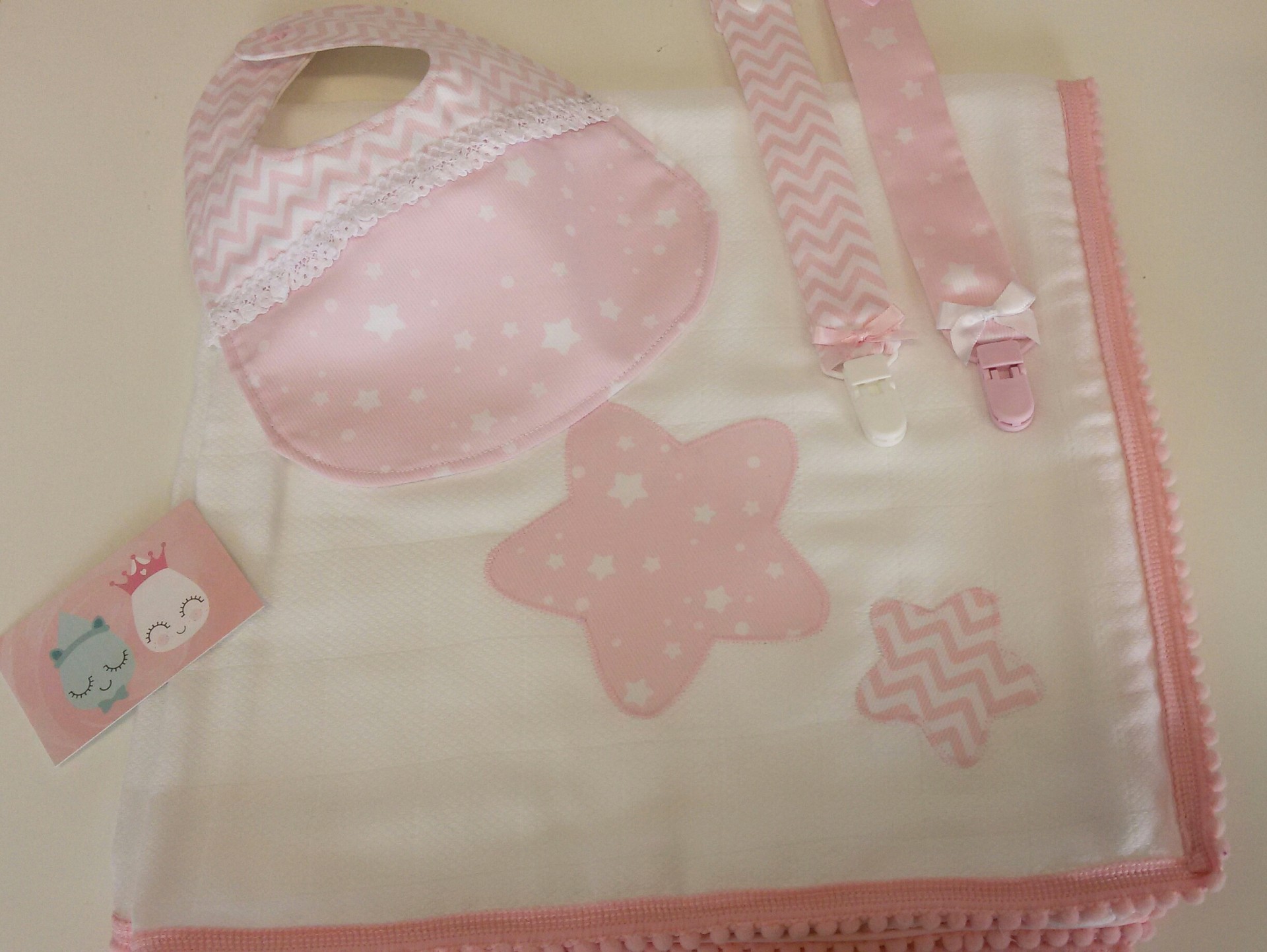 Conjunto de fralda, babete e duas fitas para a chucha com o tema estrelas em rosa.