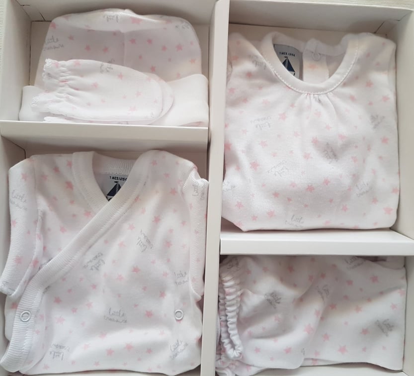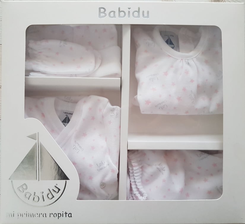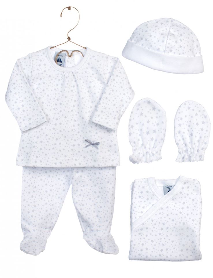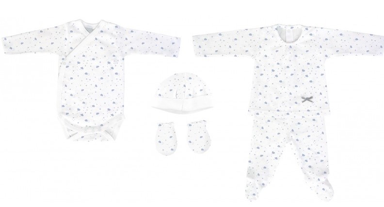 Conjunto composto por body, camisola, calças, gorro e luvas.