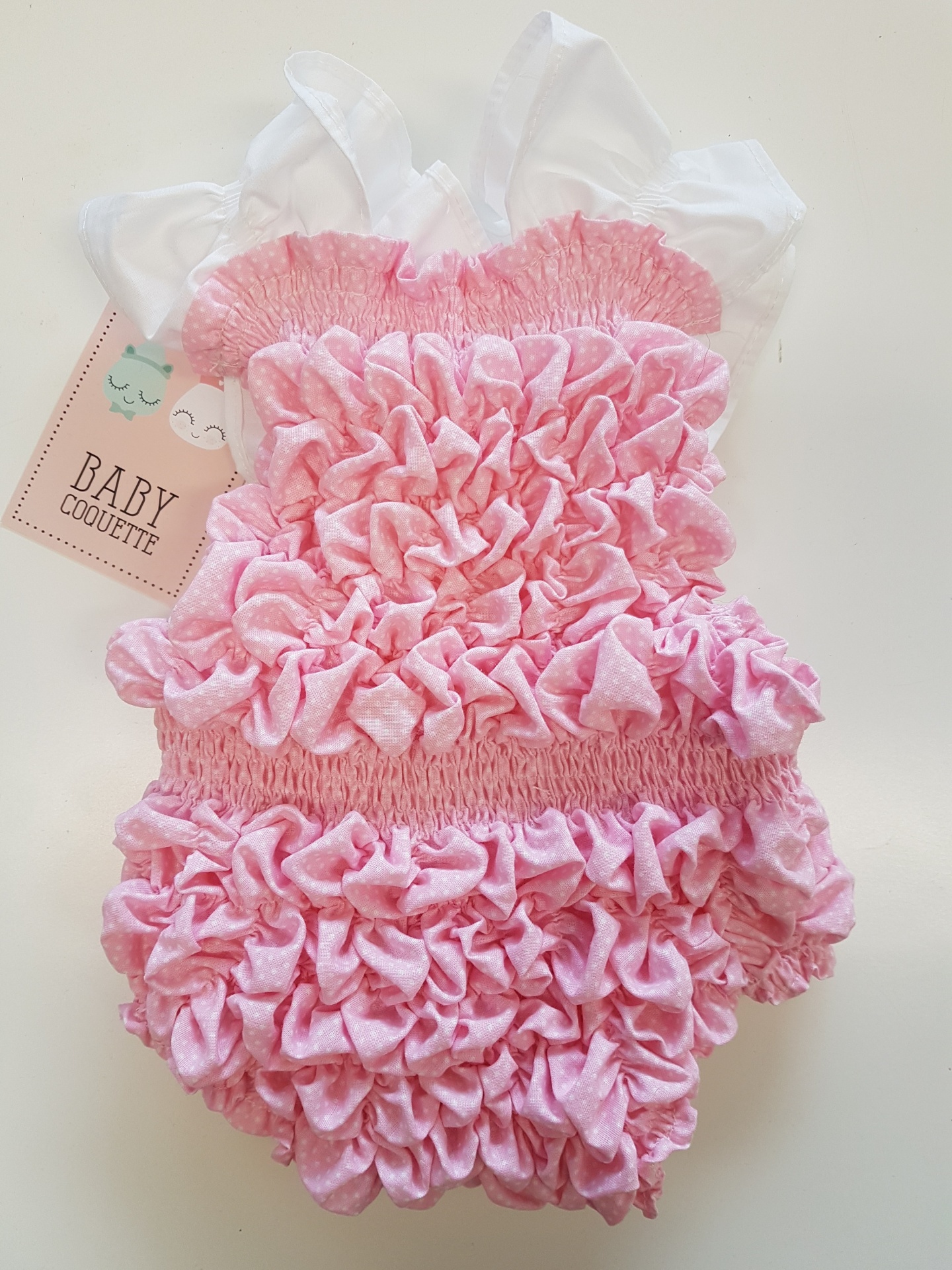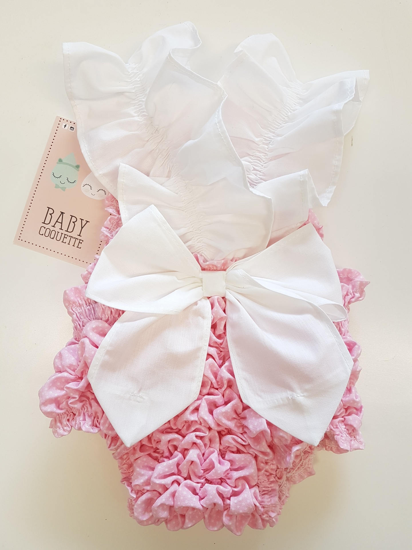 • Macacão de bebé cor-de-rosa com laço branco e alças com folhos