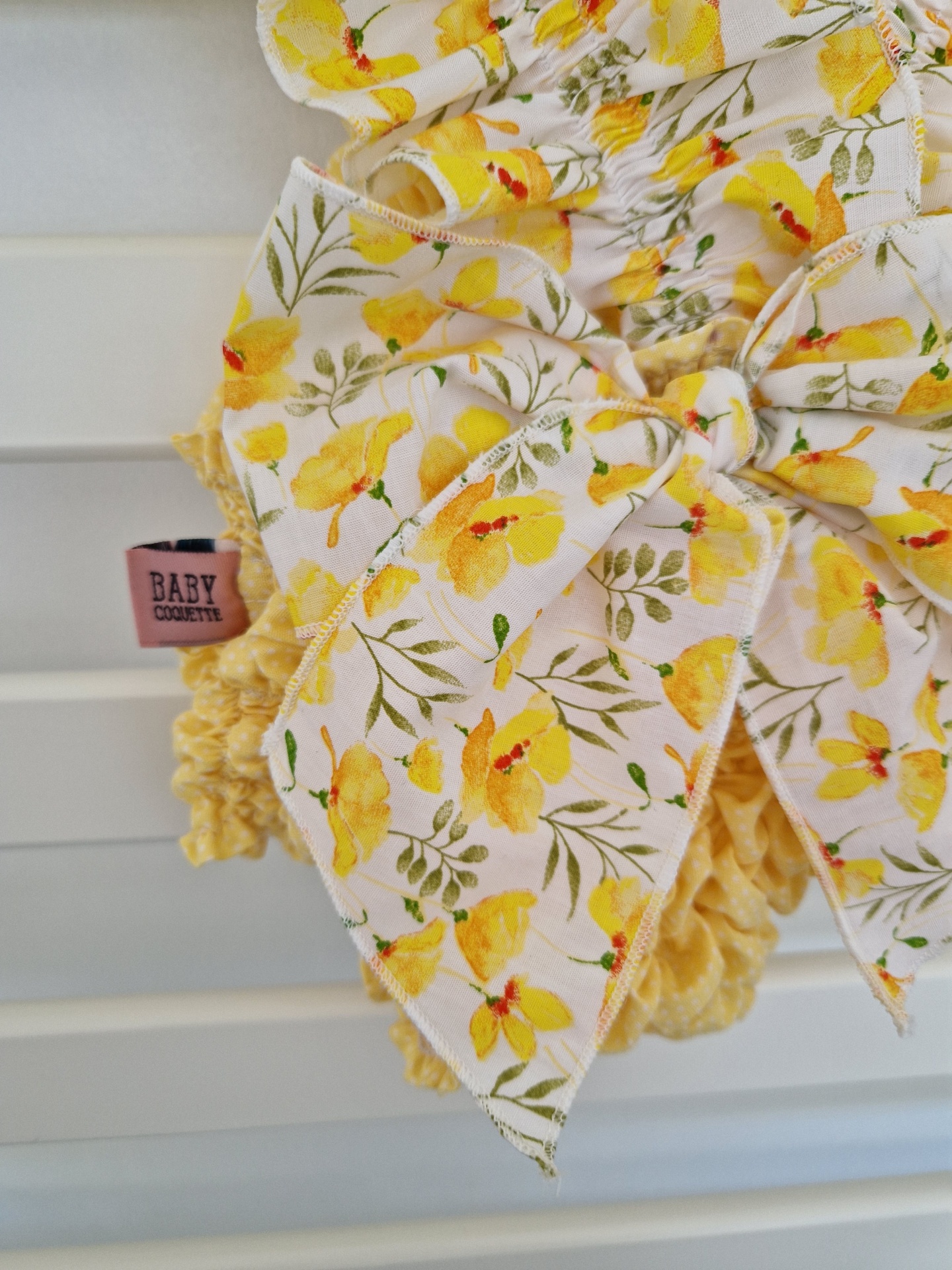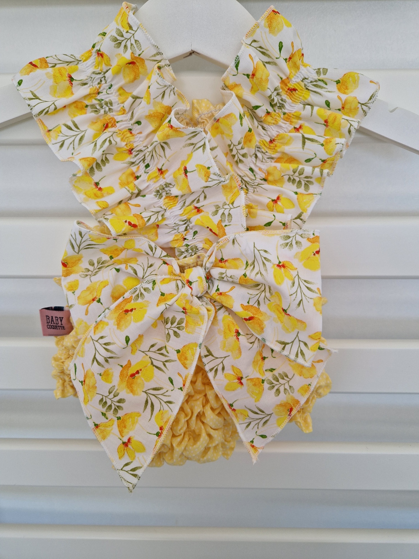• Roupa de bebé floral amarela com laço grande pendurada em cabide branco