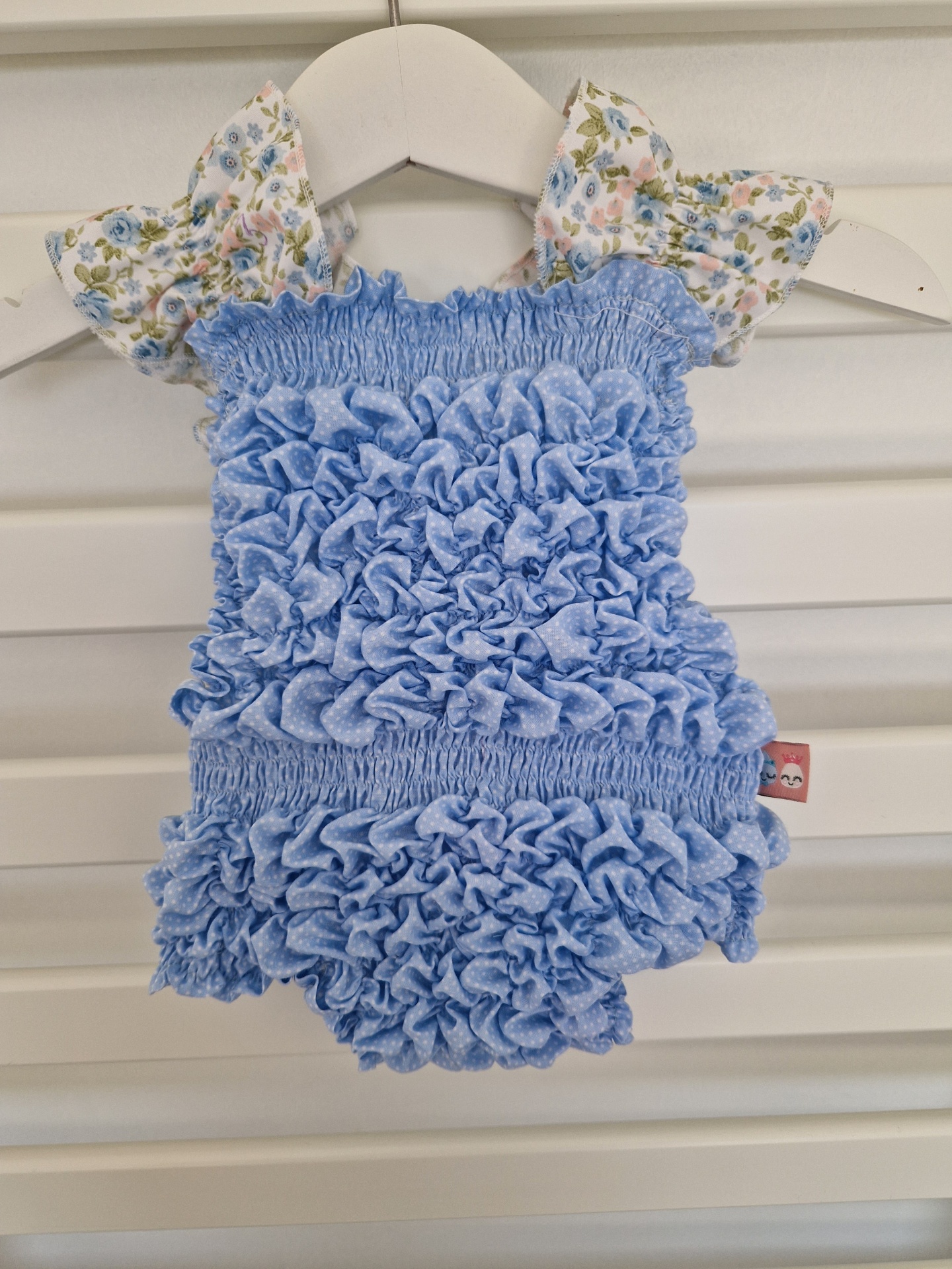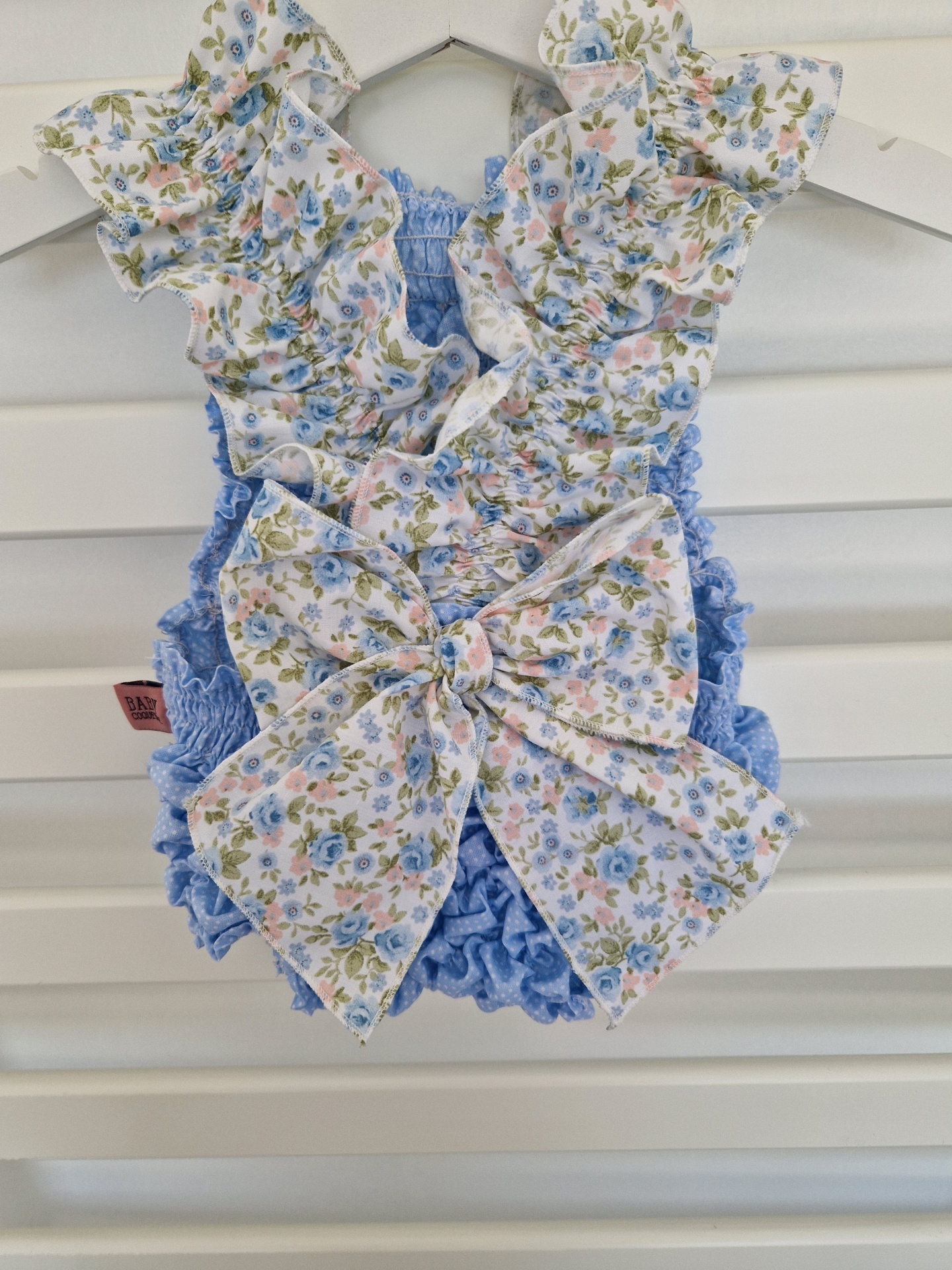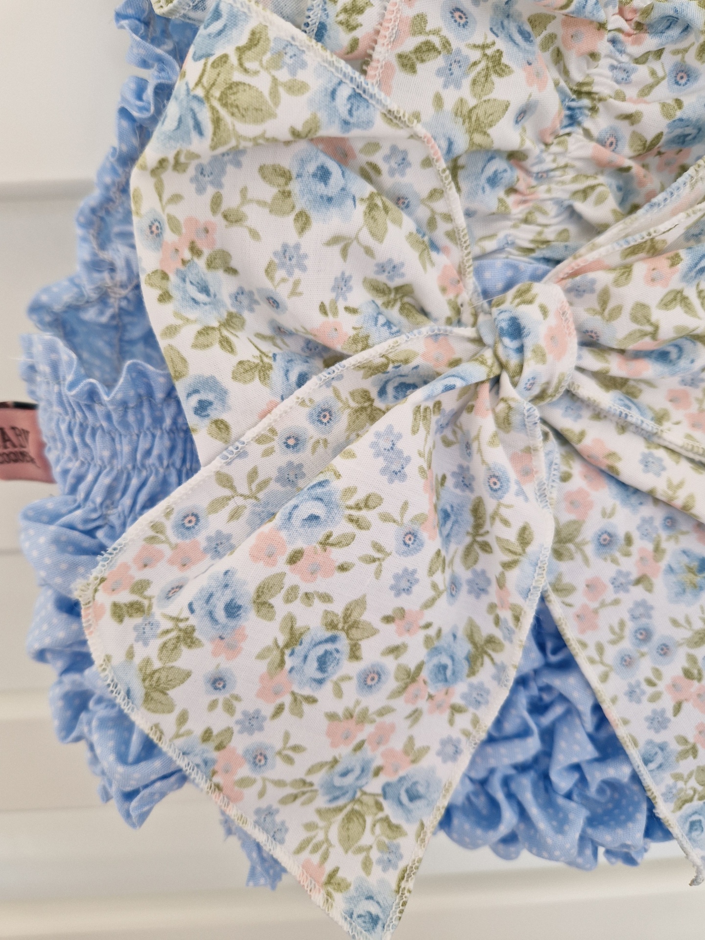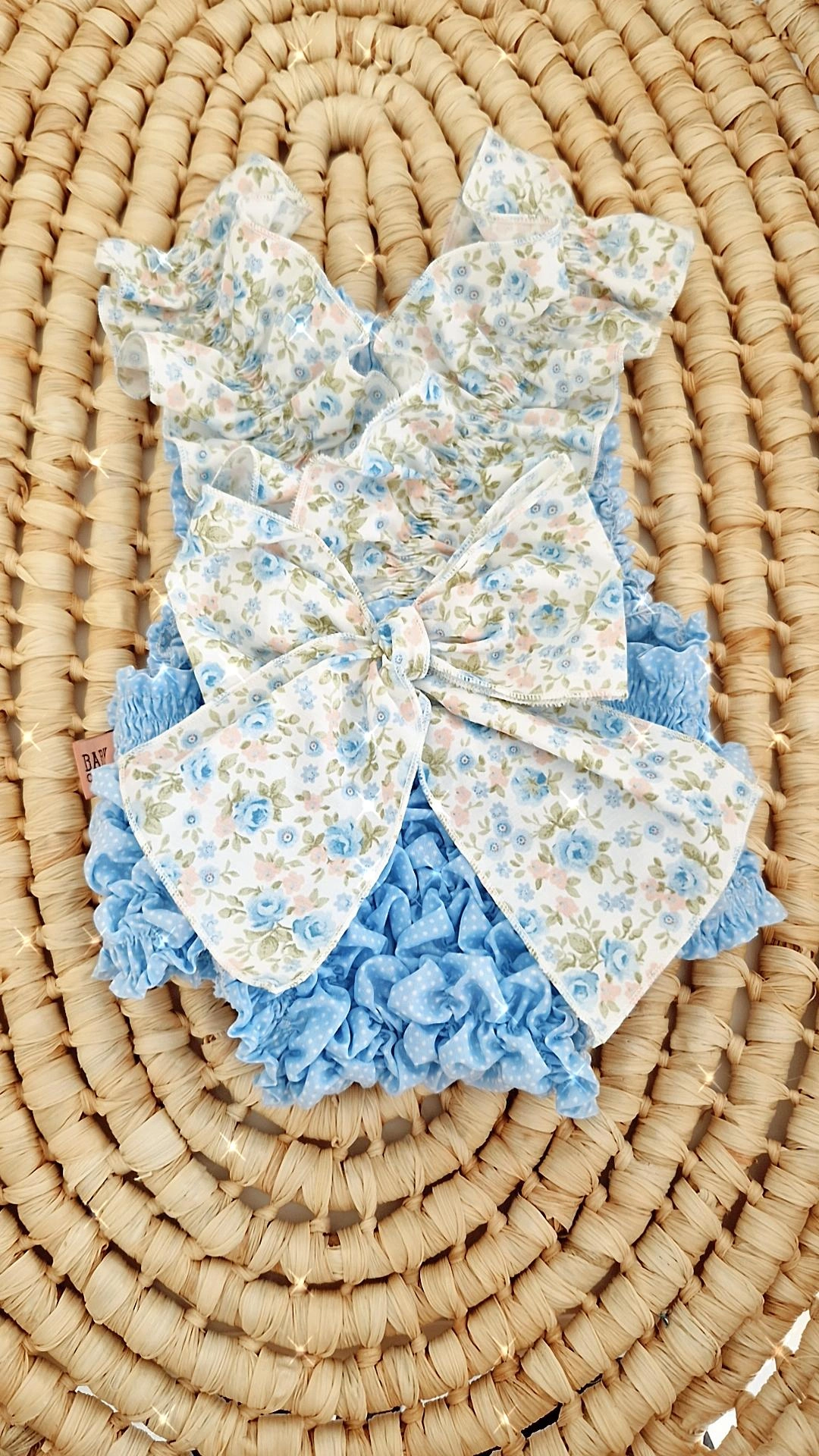 • Roupa para bebé azul com padrão floral e laço grande atrás