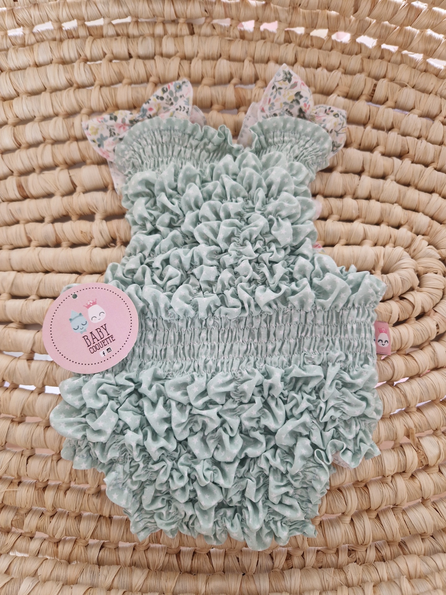 • Macacão de bebé verde água com textura franzida e alças florais em fundo de tapete de fibras naturais