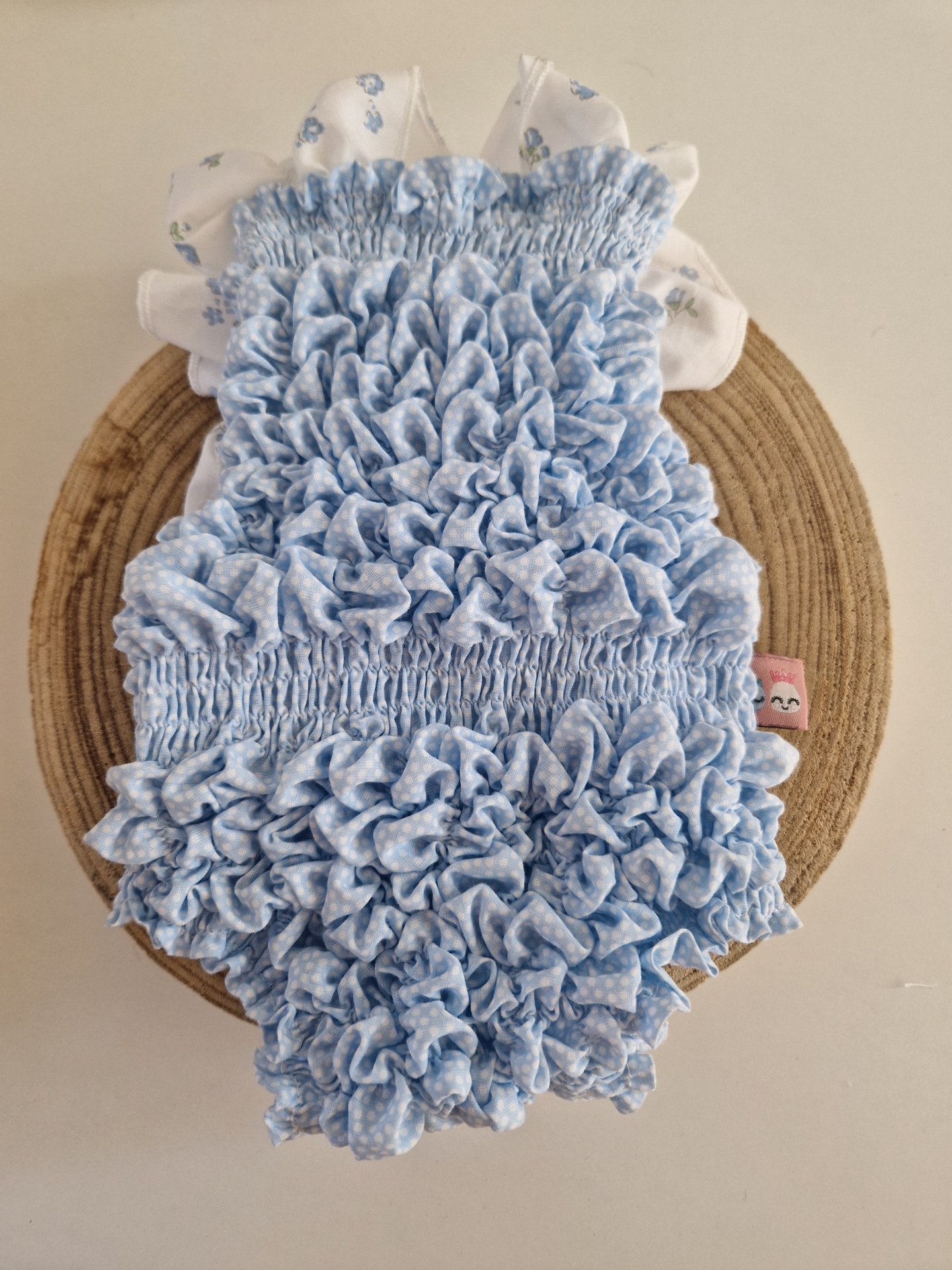 • Roupa de bebé azul claro com franjas e detalhes florais