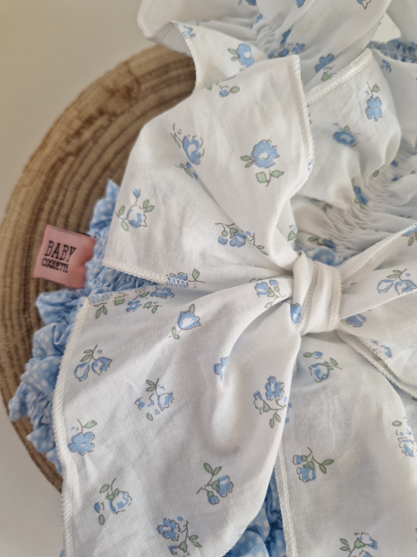 • Roupa de bebé azul claro e branca com padrão de flores azuis e laço grande