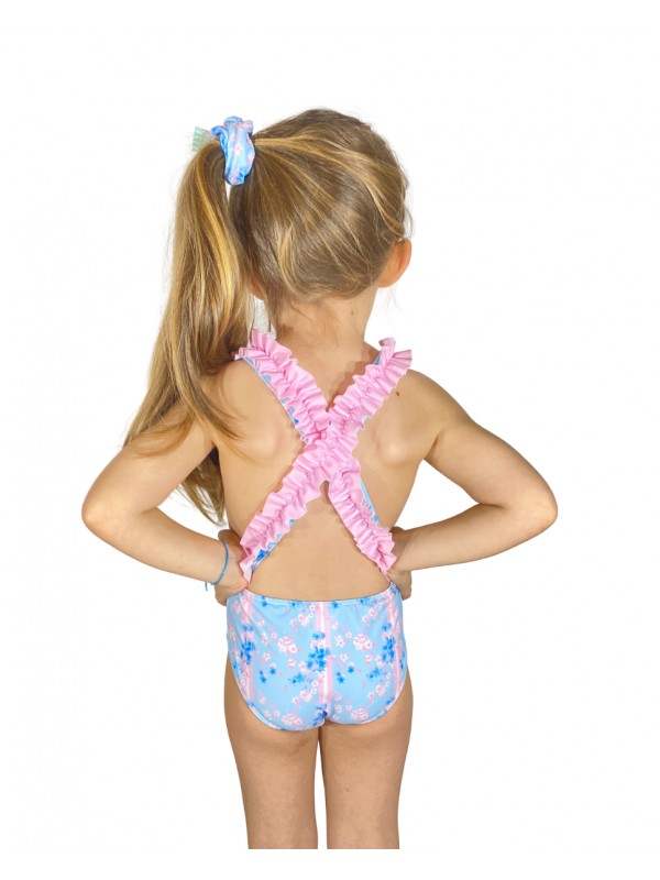 • Fato de banho infantil com alças cruzadas e padrão floral