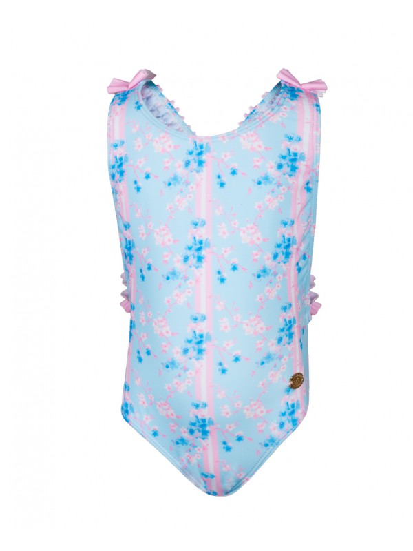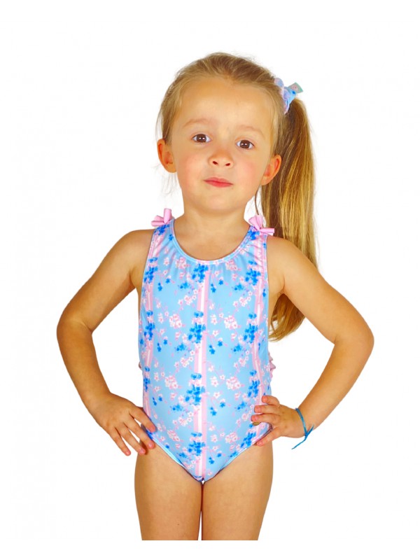 • Fato de banho infantil azul claro com flores rosa e azul e laços cor-de-rosa
