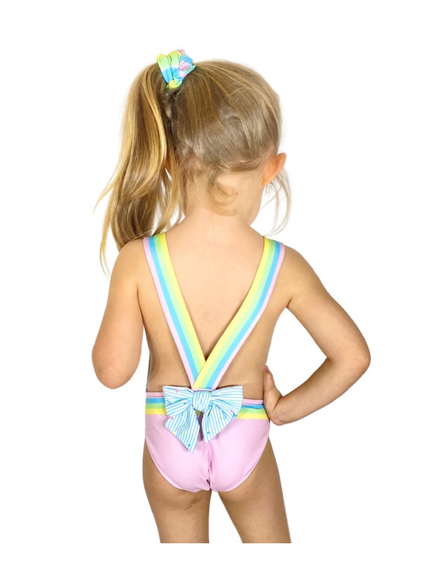 • Fato de banho infantil rosa com alças em arco-íris e laço azul atrás.