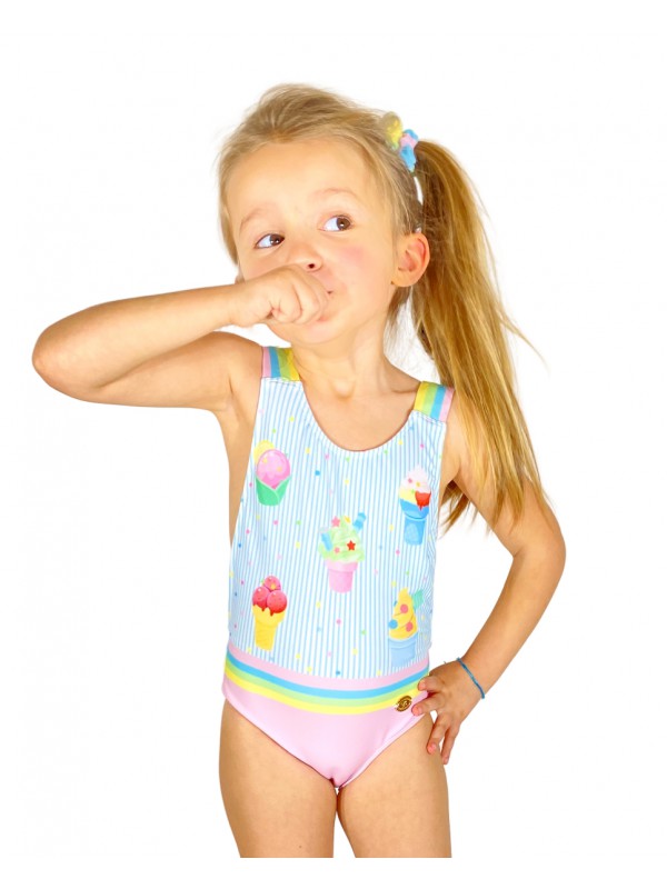 • fato de banho infantil com padrão de gelados e alças coloridas