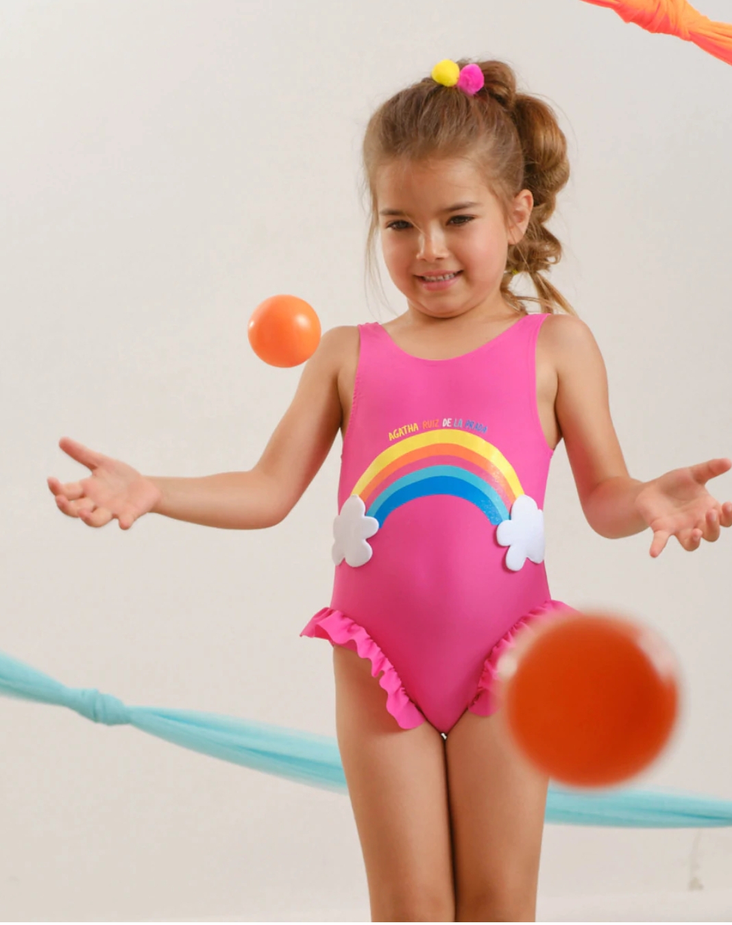 Fuchsia swimsuit with a rainbow in the center with two white clouds at the ends with ruffles on the sides, the back ends in peak.