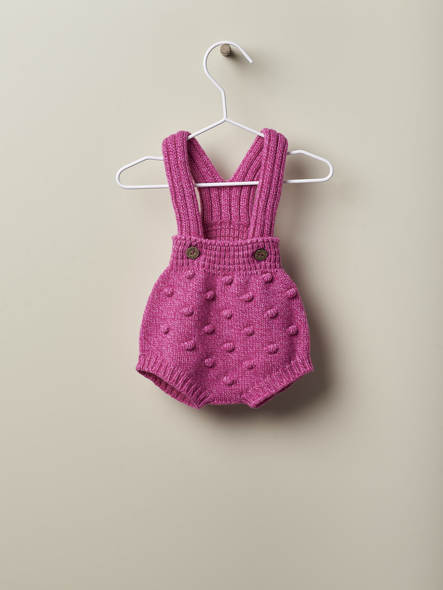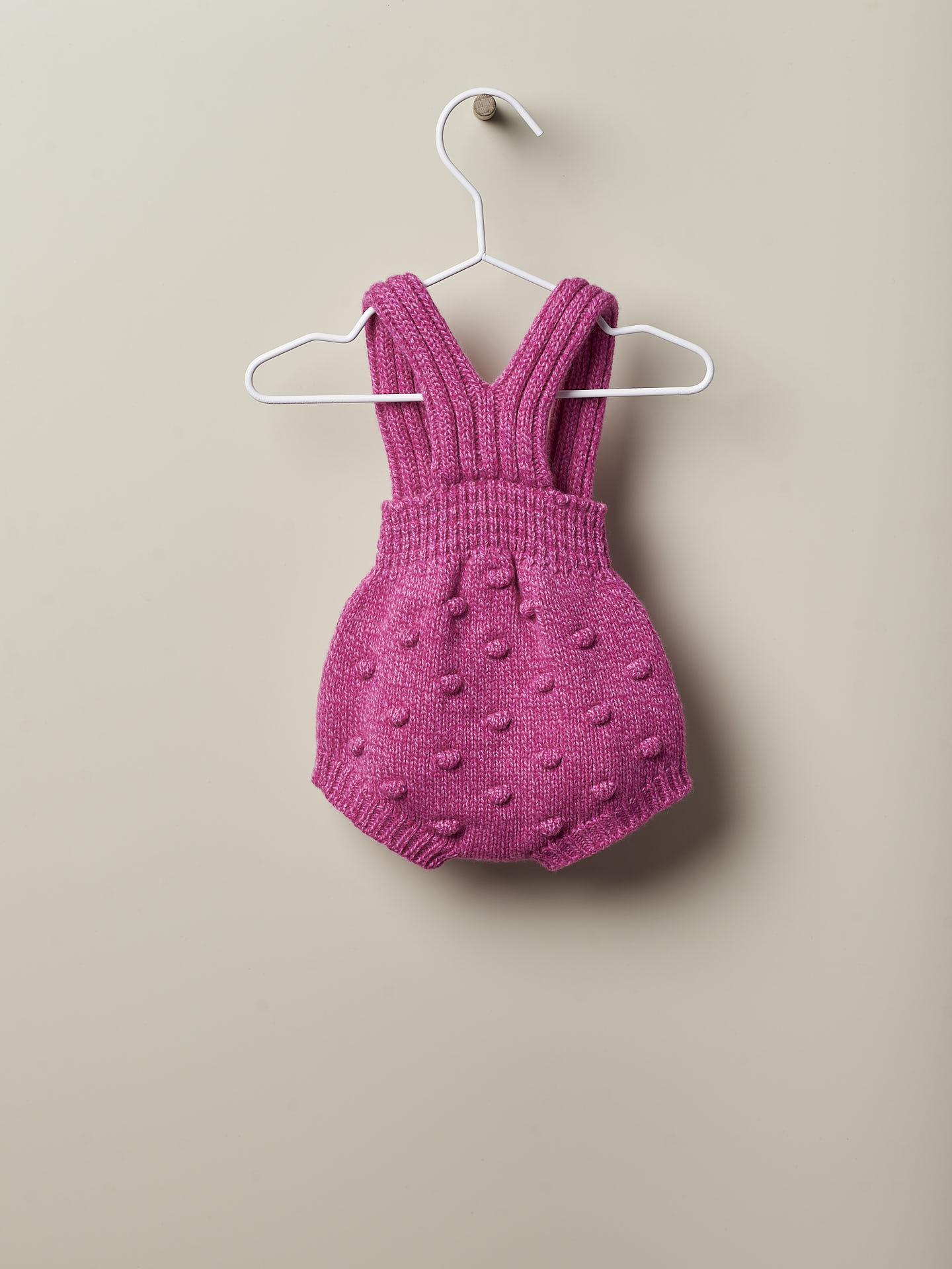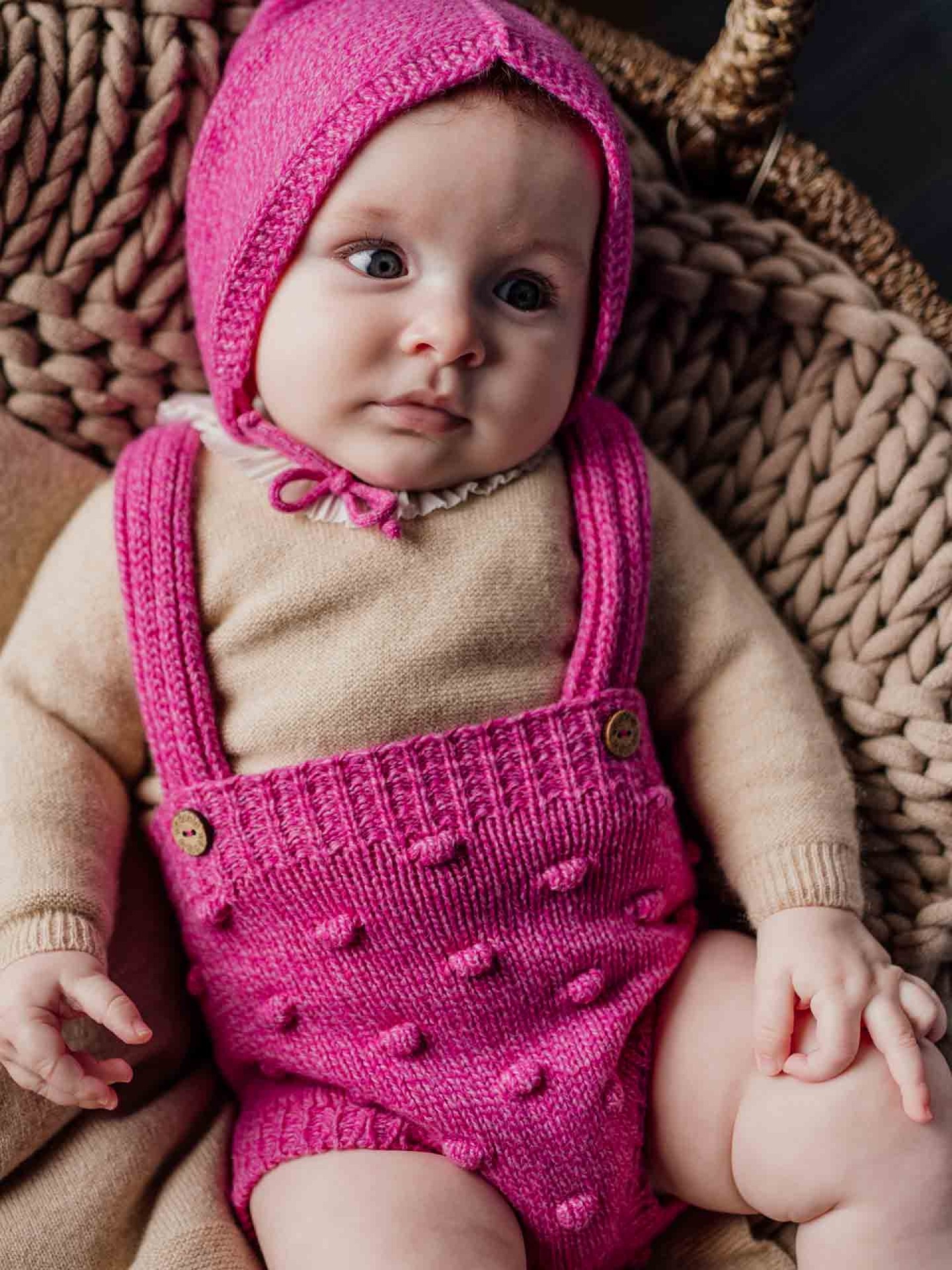 Fofo de alças tricotado numa mistura suave de lã merino e caxemira. O fofo de alças tem pequenos pompons tricotados que realçam a beleza e carácter único da peça, aperta nas alças com botões de côco. Produzido em Wholegarment, uma peça completa sem costuras, para maior conforto do seu bebé.
