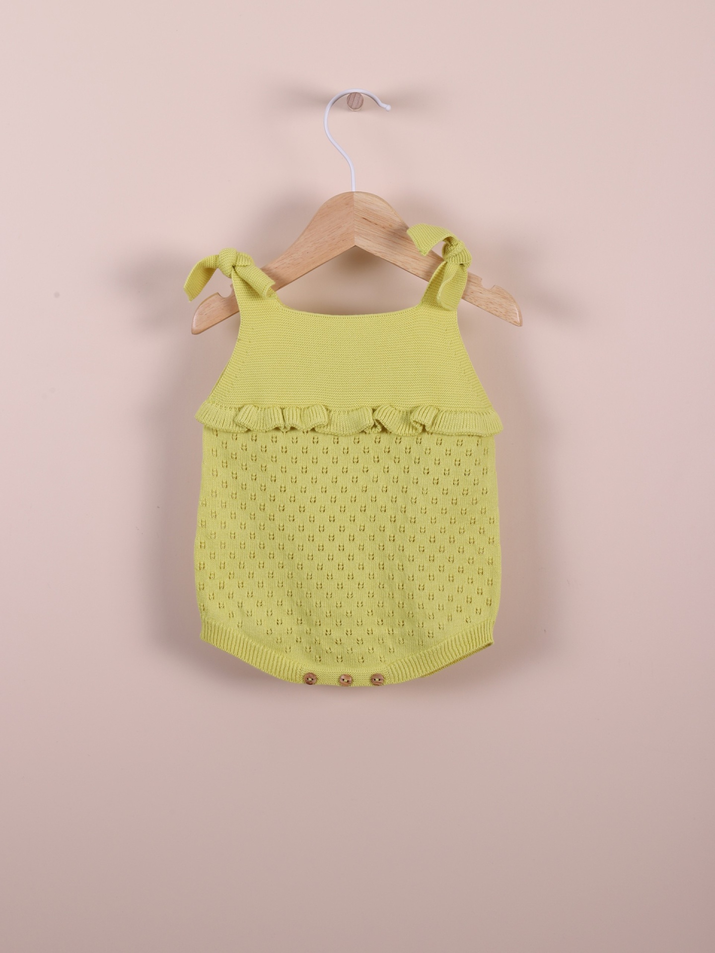 Fofo de alças tricotado em malha fina de algodão suave. O fofo com folho OCEAN FLOWER aperta nas alças com laço e entre as pernas com botões de madeira. Produzido em Wholegarment, uma peça completa sem costuras, para maior conforto do seu bebé.