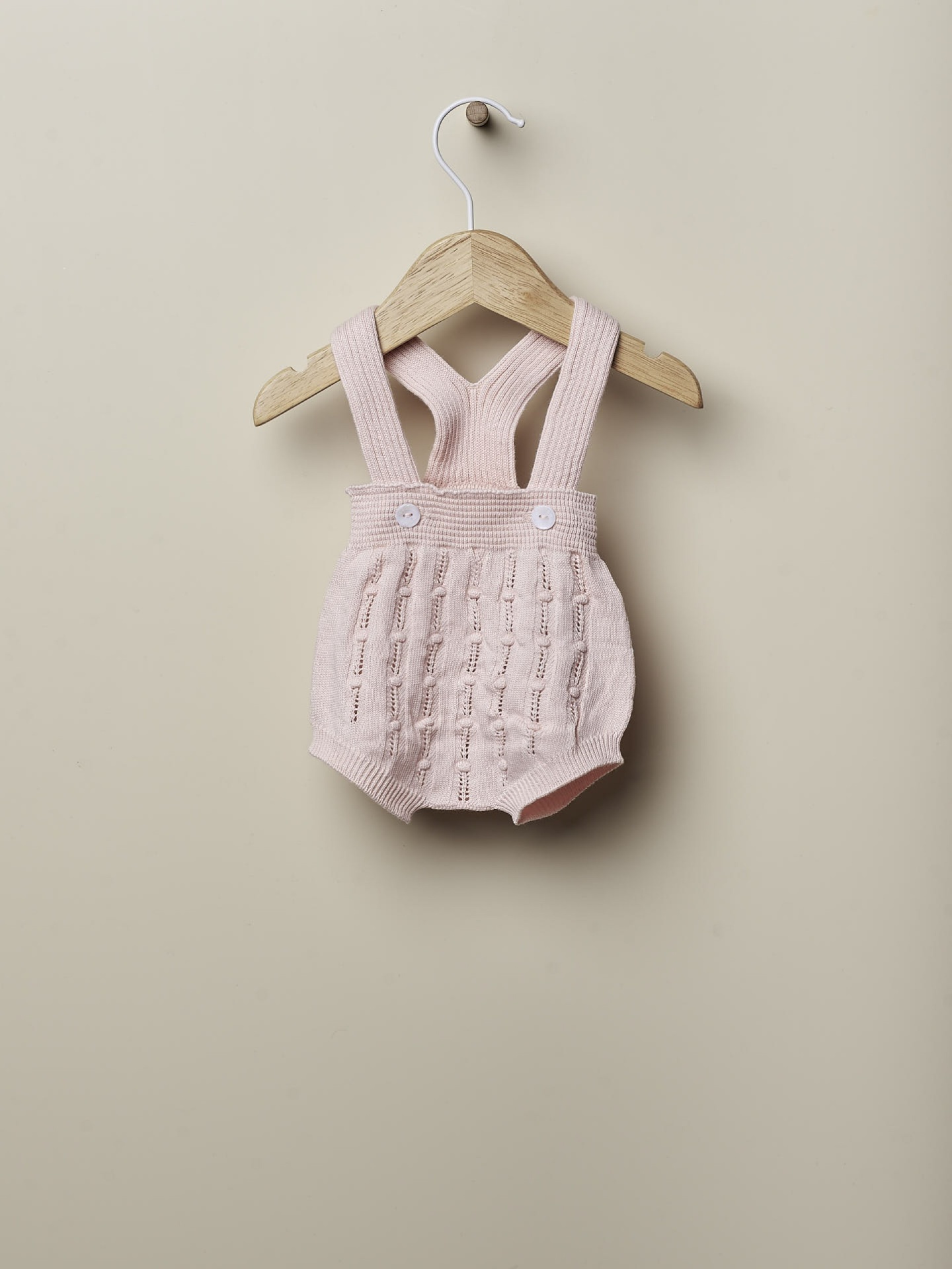 • Macacão de bebé cor de rosa com alças largas pendurado num cabide de madeira