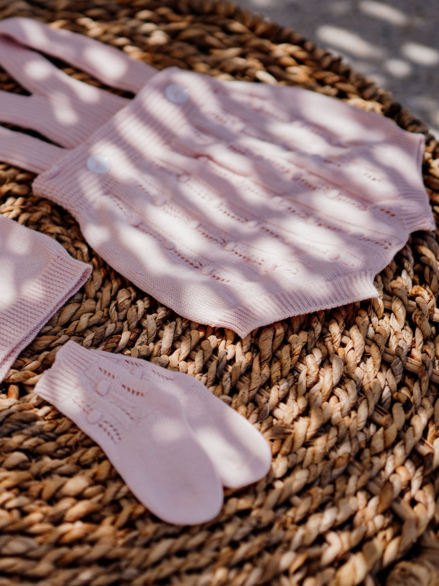 • Conjunto de roupa de malha rosa claro com padrão rendado em superfície entrelaçada de palha