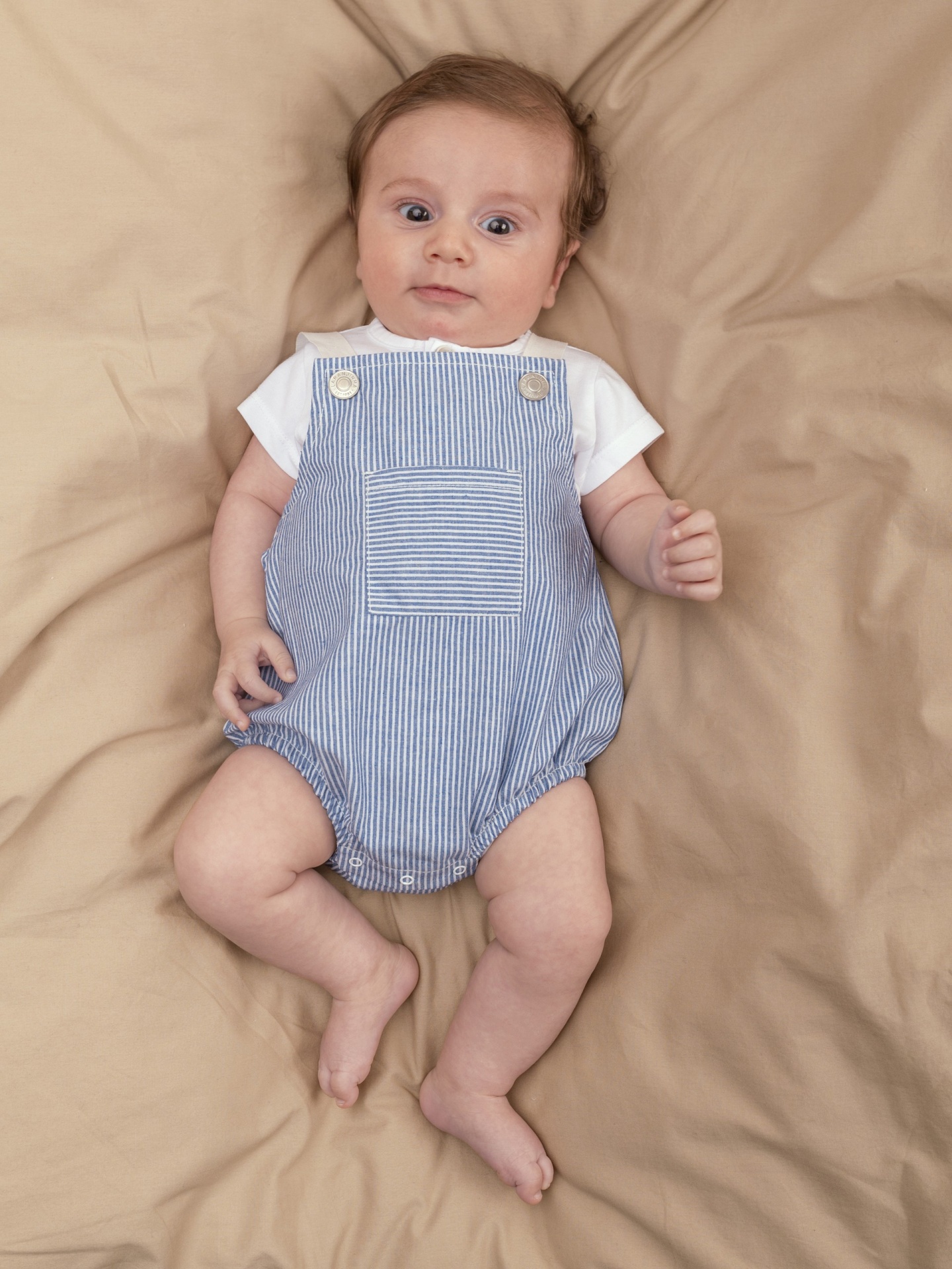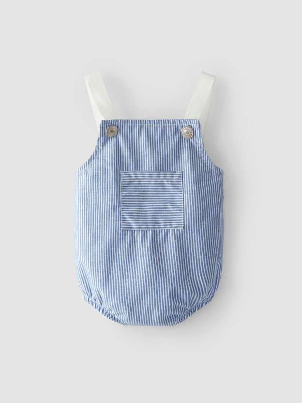 Fofo em tecido de algodão orgâncio e reciclado com bolso na frente. Elasticidade nas costas para maior conforto. Aperta com molas nas alças em duas posições e no entrepernas.