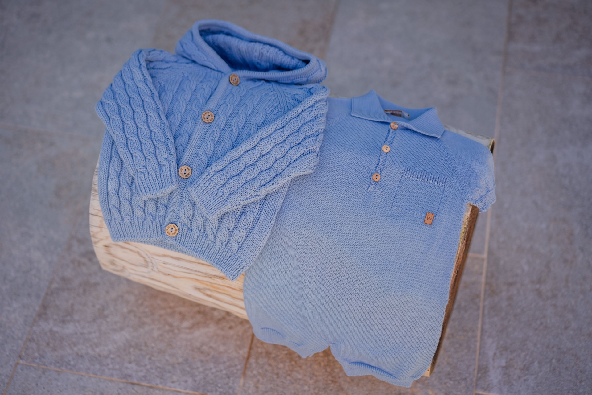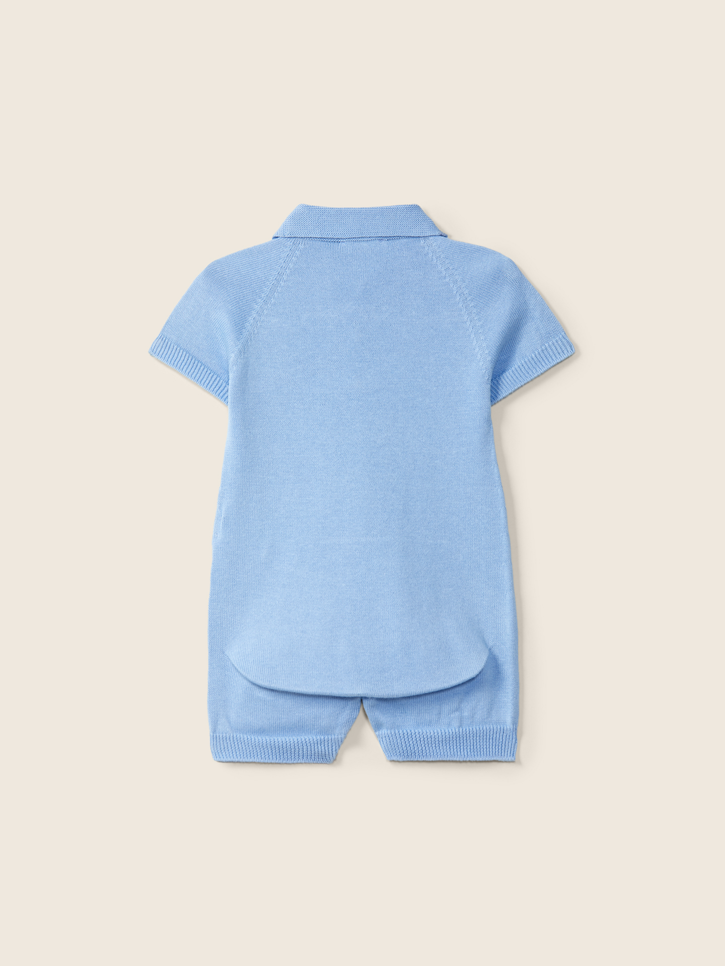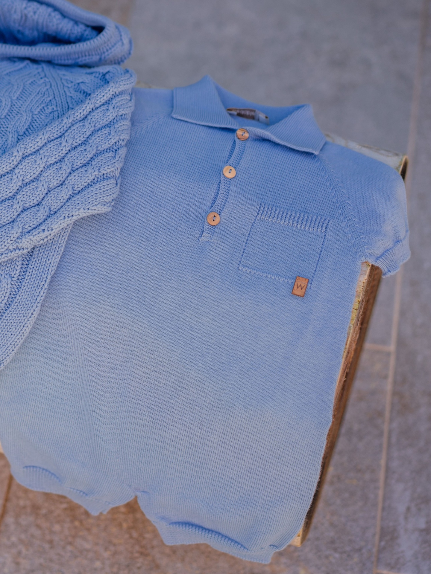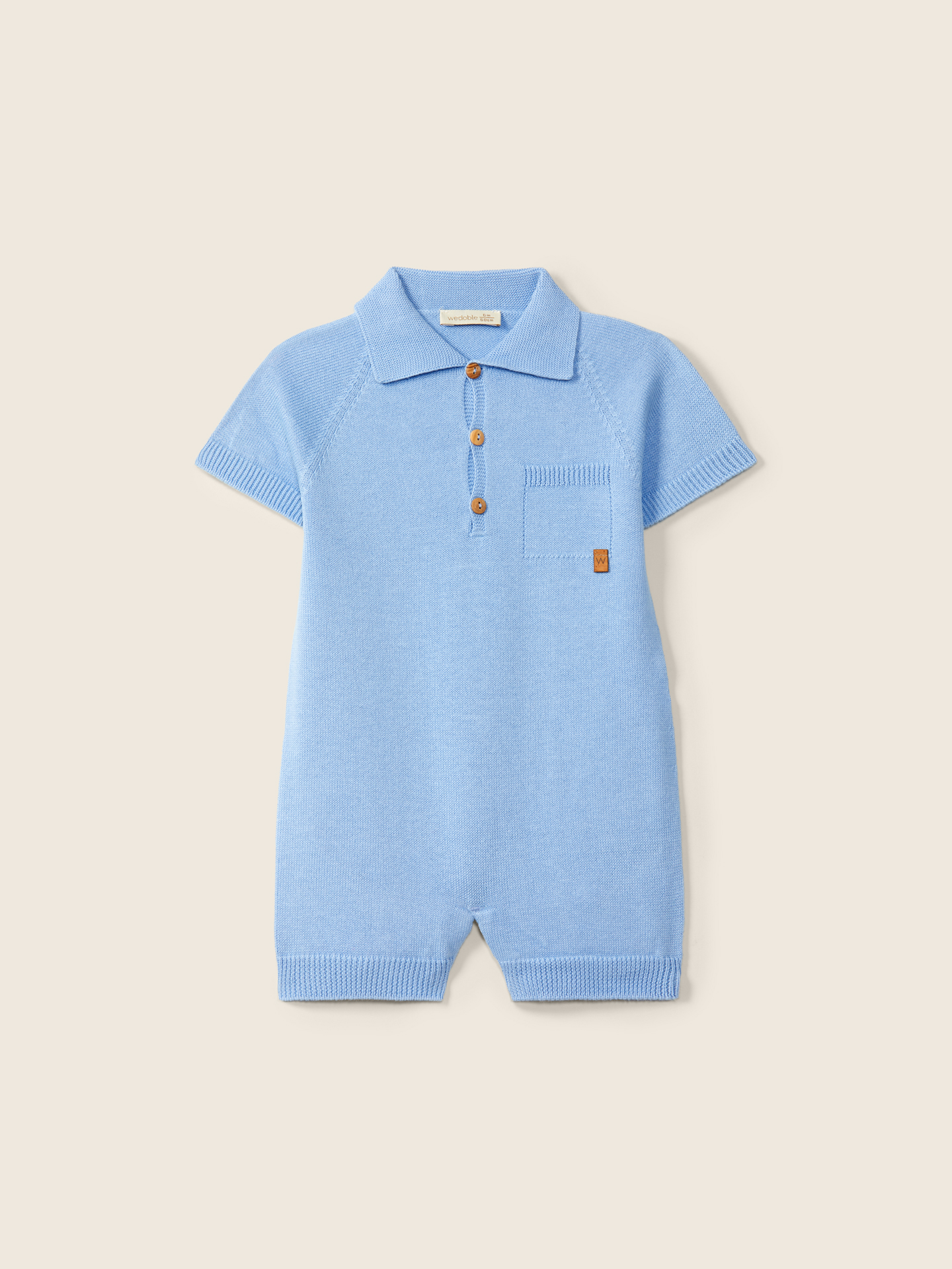 Fofo polo tricotado em malha de algodão orgânico, suave e respirável. O fofo polo de manga curta SUMMER TIME aperta na frente com botões de madeira e entre as pernas com molas. Produzido em Wholegarment, uma peça completa sem costuras, para maior conforto do seu bebé.