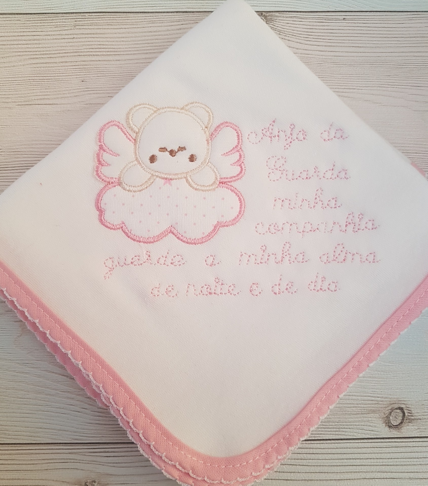 Frase bordada: Anjo da guarda minha companhia, guarda a minha alma de noite e de dia.