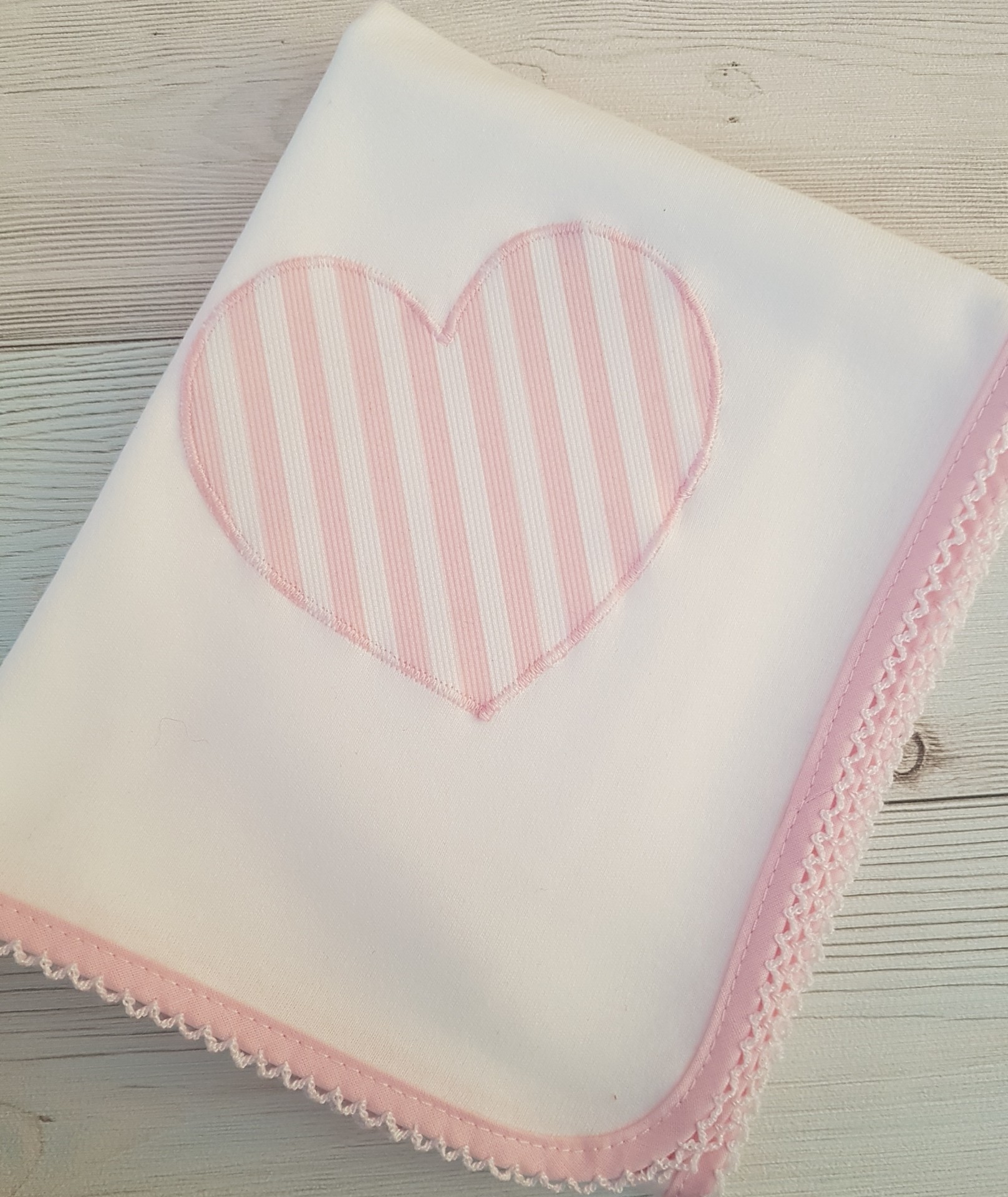 Aplicação de coração em tecido rosa com riscas brancas.