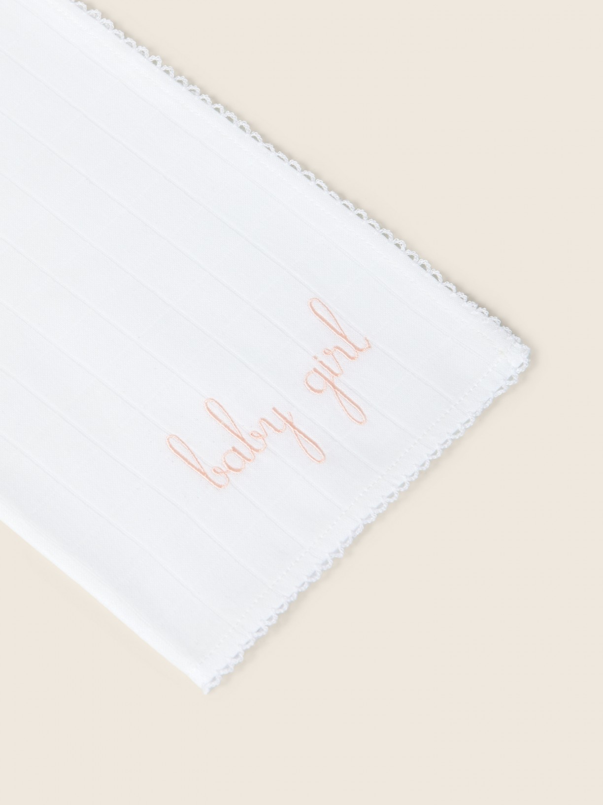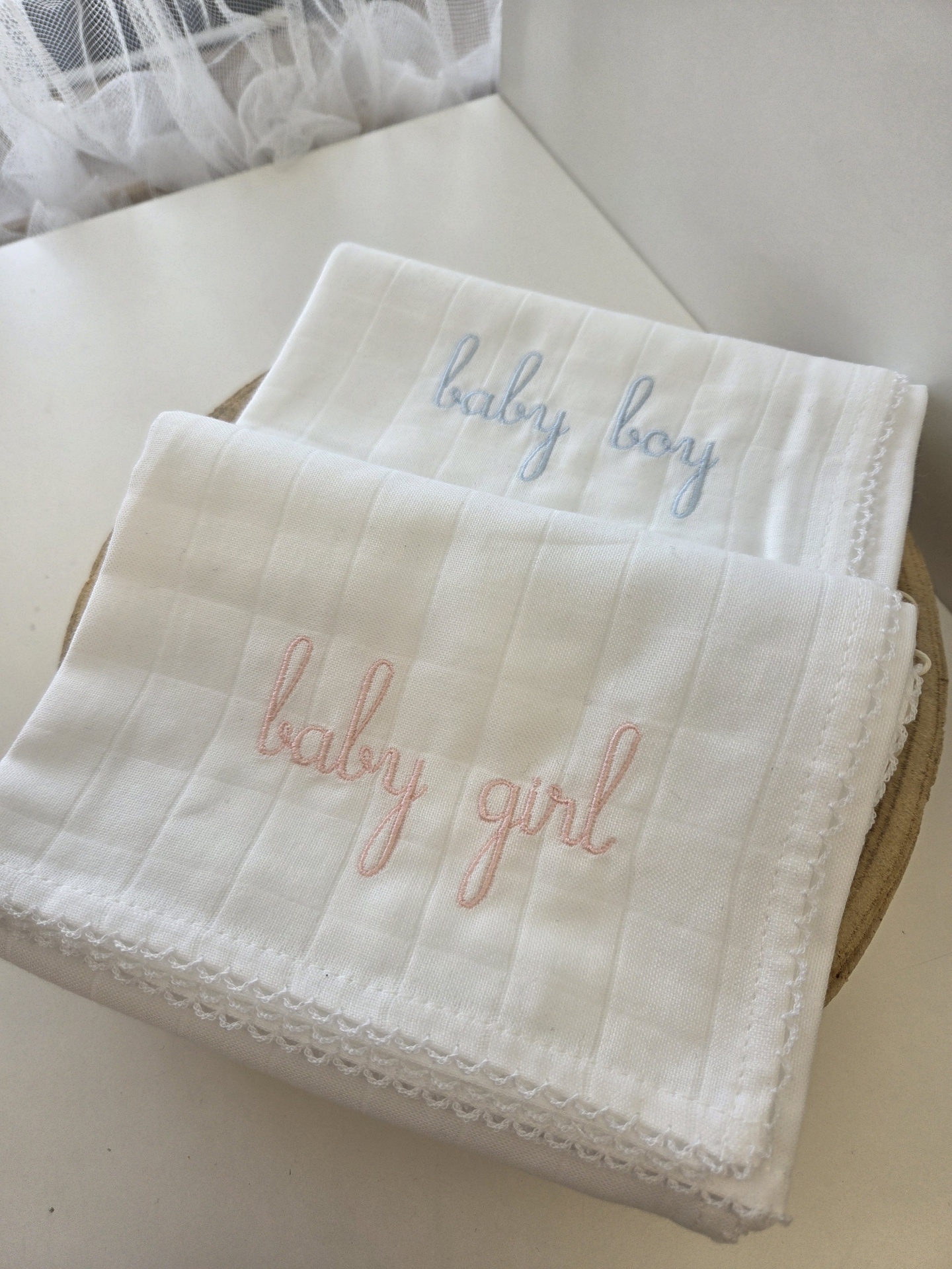Fralda de pano branca bordada com as palavras "baby girl" ou "baby boy", produzida em algodão suave.